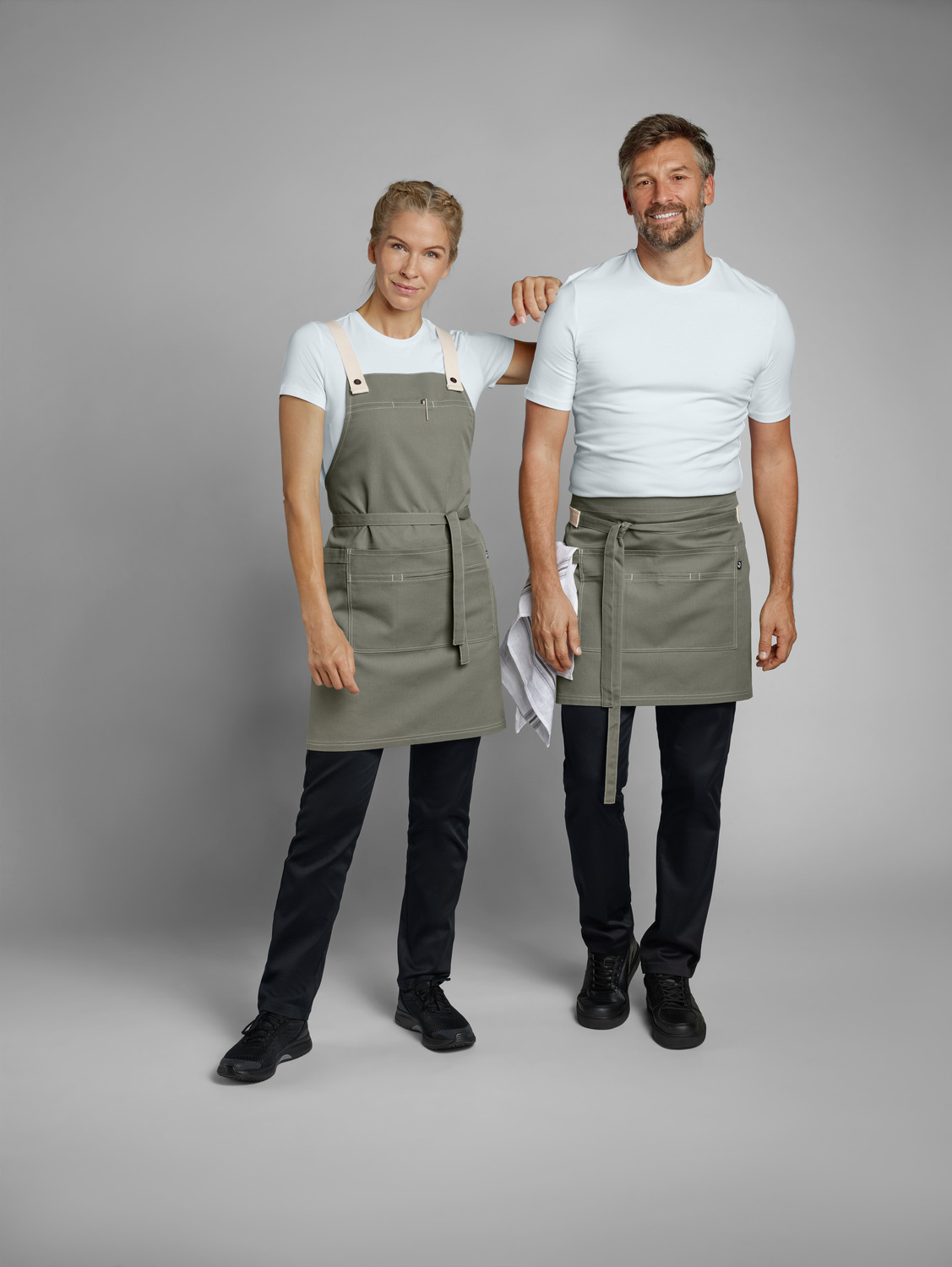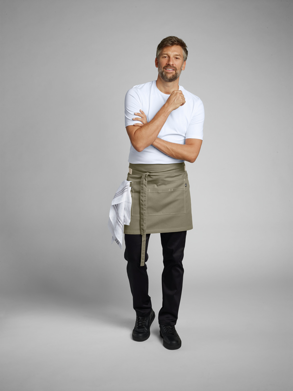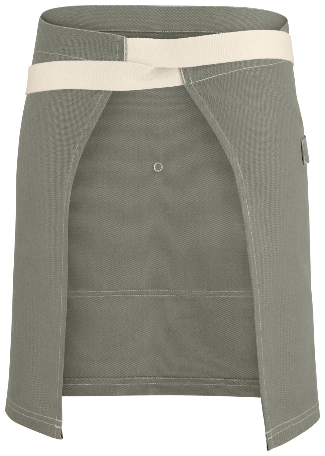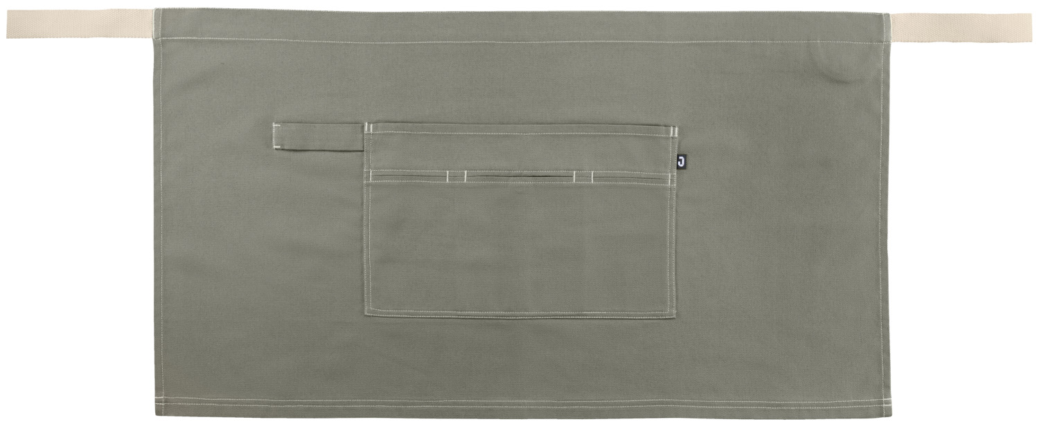 65% polyester, 35% cotton. 270 g/m². 60°C wash. Modern apron made from a lightweight canvas blend with contrasting topstitching. With central, two-part pocket including snap button and tea towel loop on the right. Two-piece waistband made of light-colored cotton ribbon and outer fabric. Pocket dimensions: 34 x 21 cm (WxL).