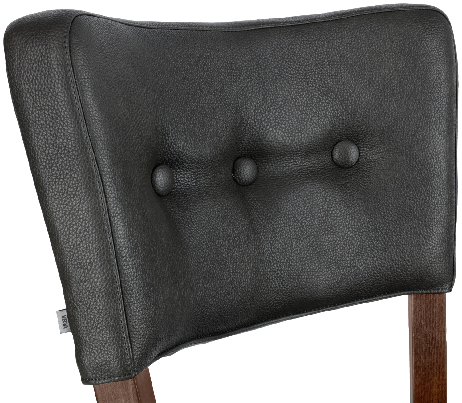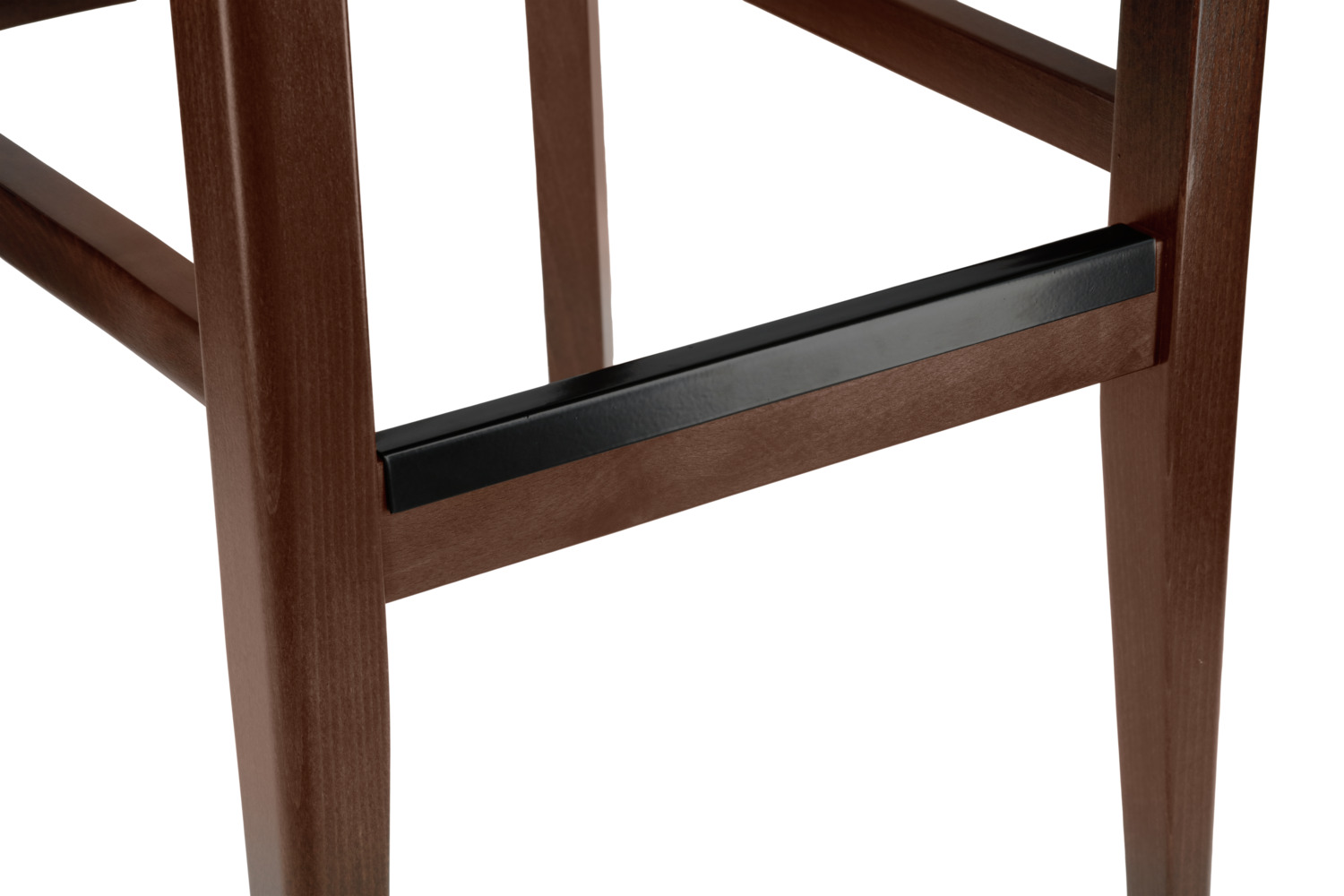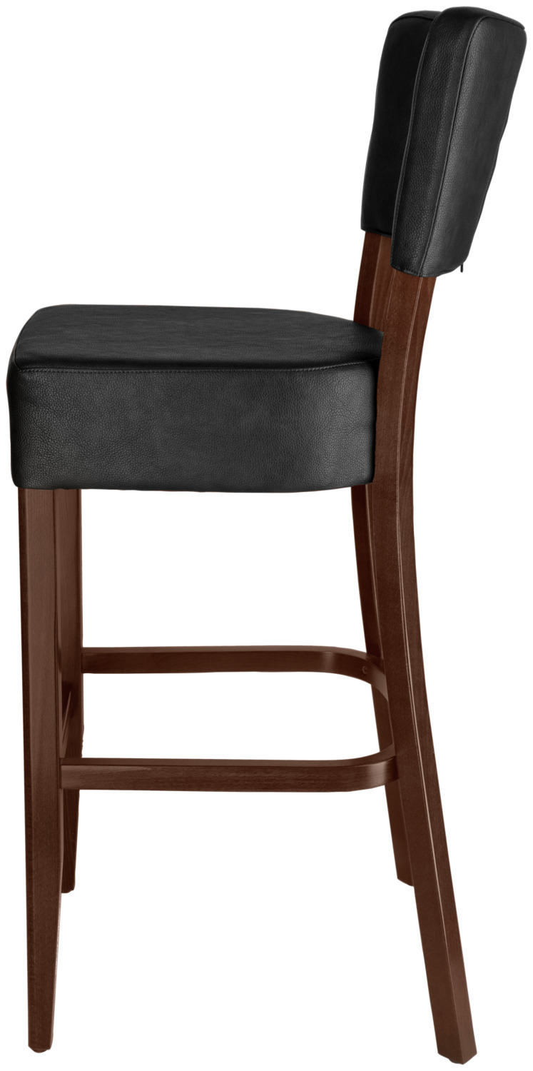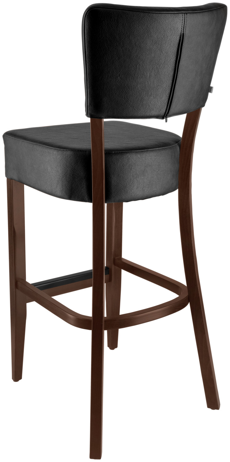 High-quality bar chair made of imitation leather and tobacco-stained beech legs. The back is finished with classic buttonholes and provides a timeless elegance for various furnishing styles. Fire-retardant cover. Suitable for indoor use only. Includes plastic glides and powder-coated steel kick plate. Supplied assembled. Order matching chair at the same time.