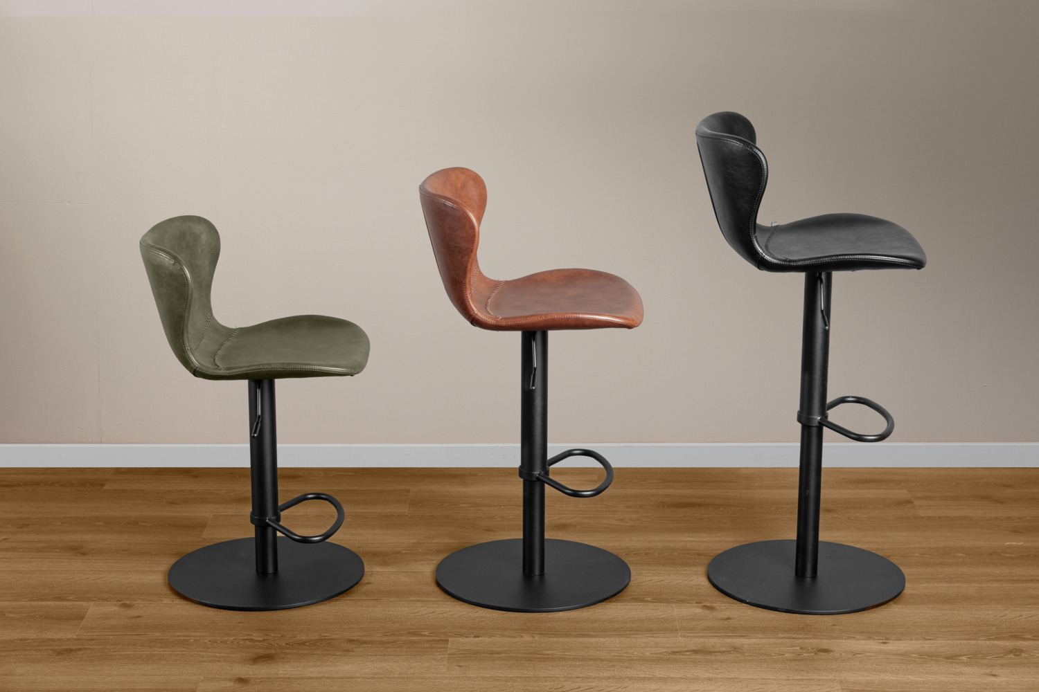 Bar stool with seat made of imitation leather in vintage look and sturdy, powder-coated steel base with footrest in matt black finish. Seat rotates 360 degrees and is height-adjustable thanks to a gas pressure spring. Footrest always remains at the same distance from the seat (40 cm), infinitely variable seat height adjustment possible. Min. seat height 54 cm, max. seat height 79 cm, adjustable up to 25 cm. Only suitable for indoor use. Supplied disassembled, incl. fixing material.