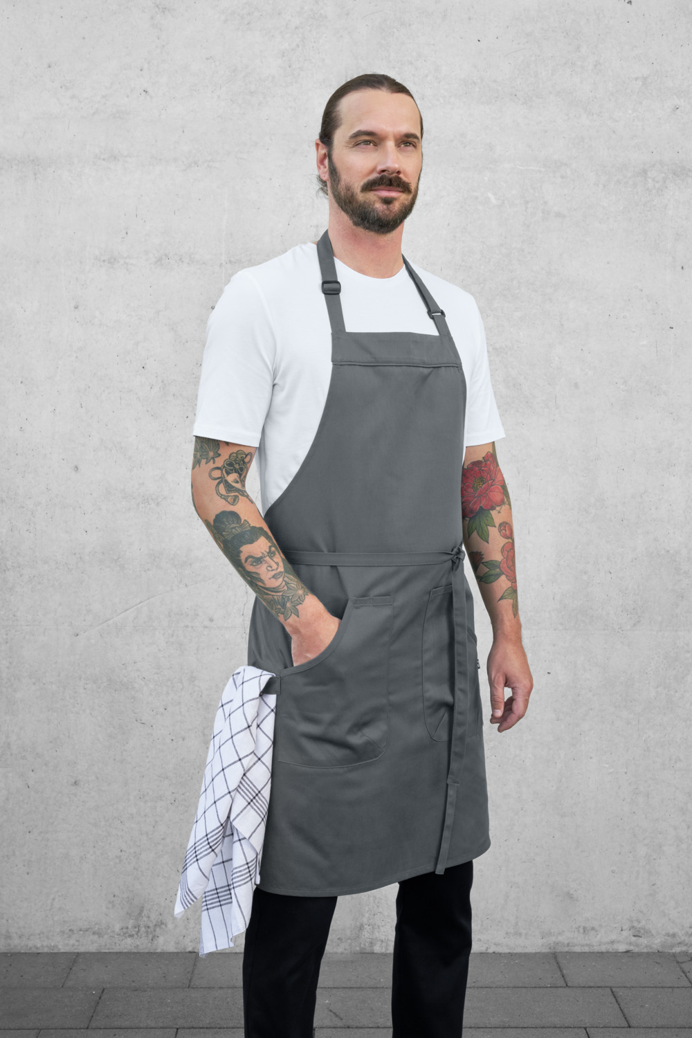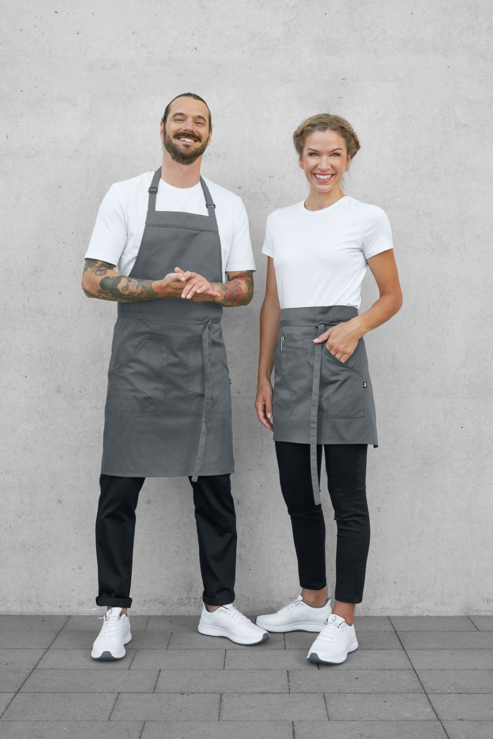 65% polyester, 35% cotton. 200 g/m². 60°C wash. High-quality bib apron made from a smooth, easy-care blended fabric. With two patch pockets with rounded opening and an attached loop for a tea towel on the side. The neckband is adjustable in length using a slider. With waist ties made of outer fabric for tying. Pocket dimensions: 2 pockets each 26.5×19.5 cm (LxW).