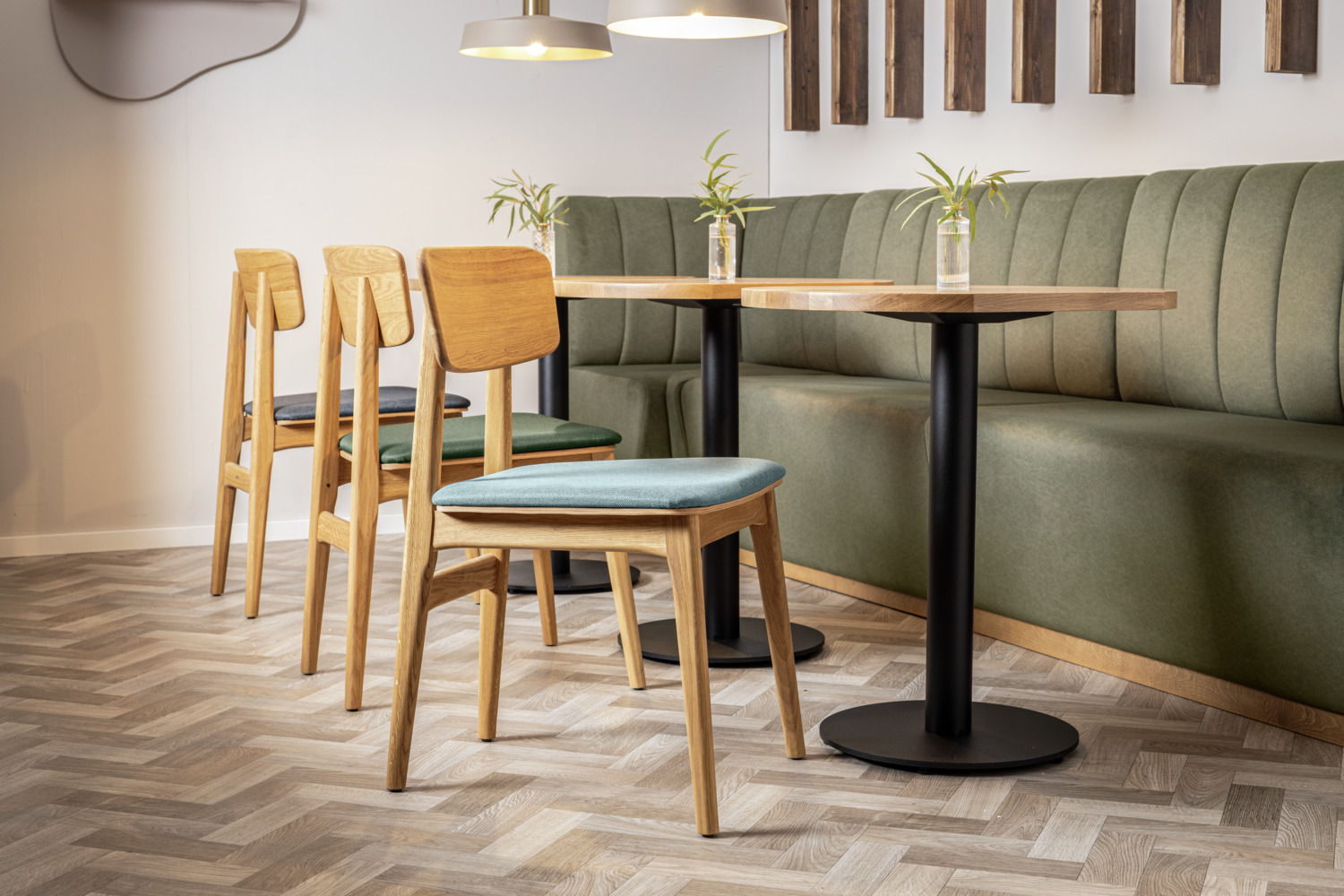 High-quality oak chair with seat cushion and a visible filigree wooden top in Scandinavian design. The slightly bevelled backrest matches the seat perfectly. A particular advantage of the Yorin wooden chair is that the seat cushion can be easily replaced if necessary. This means that your chairs will always look neat and inviting, even under heavy use in the catering and hotel industry – without the need for time-consuming cleaning or expensive new purchases. Ideal for anyone who values hygiene, flexibility and a permanently clean ambience. Only suitable for indoor use. Supplied assembled.