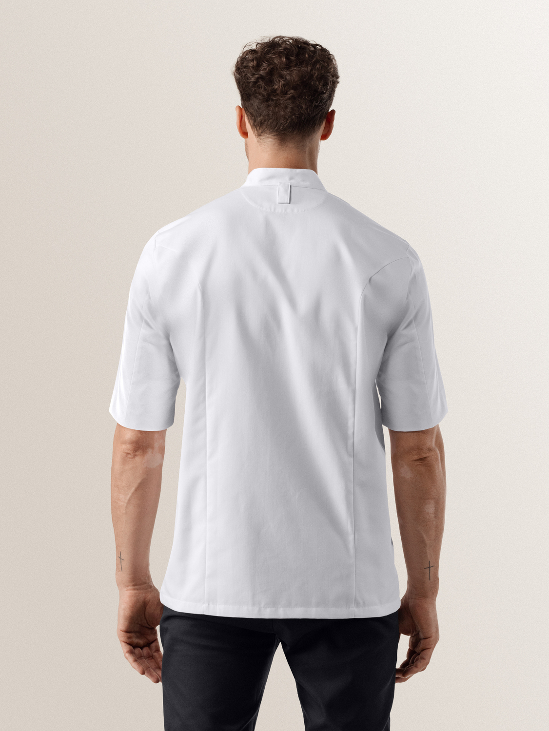 Chef Jacket Bastien offers a simplified design with short sleeves, based on a classic chef jacket. Specially tailored for line chefs, this chef jacket is crafted from our most wear-resistant fabric, designed to withstand the wear and tear of daily kitchen use. Available in larger quantities and suitable for industrial laundry cycles. This version simplifies our Chef Jacket Dave with a crossover closure, short sleeves, and a stitched pen pocket.