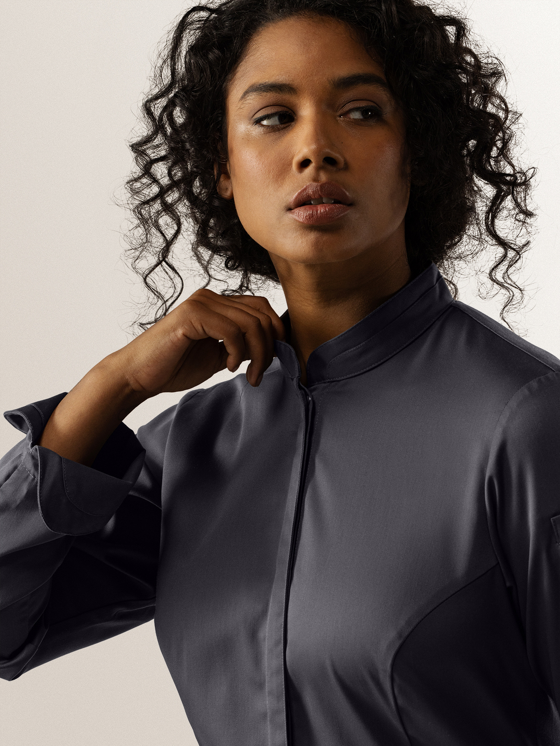 An elegantly cut white chef’s jacket for women with a perfect fit and a wonderfully soft fabric. Thanks to the use of stretchy polopiqué material for the back and hard-wearing Tencel for the front, this white women’s chef’s jacket is an innovative model. Material composition: 50% polyethylene, 50% Tencel