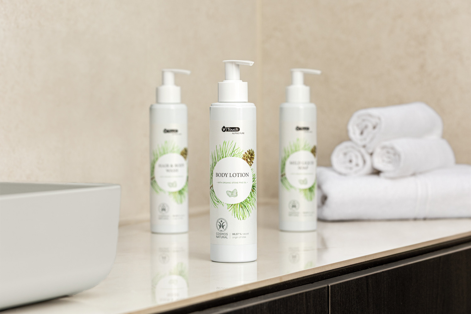 Revitalising, nourishing body lotion V-Touch Alpine Pure. Certified natural cosmetics with guaranteed genuine organic Swiss stone pine oil from certified organic farming. The body lotion with its aromatic, woody Swiss stone pine fragrance has a nourishing, regenerating effect on body and soul, stimulating and harmonising blood circulation. Apply a thin layer to the skin after showering or bathing. The practical pump dispenser can be refilled easily and flexibly. Dermatologically tested and pH-neutral! The body lotion complements the V-Touch Alpine Pure hotel cosmetics range, order the matching V-Touch Alpine Pure bath/shower gel at the same time. The pump dispenser is made from 100% recycled material and is refillable. Contents: 140 ml or 240 ml pump dispenser. Do not use for children under 3 years! Do not get in eyes and do not apply undiluted to mucous membranes! Discontinue use immediately if skin irritation occurs!