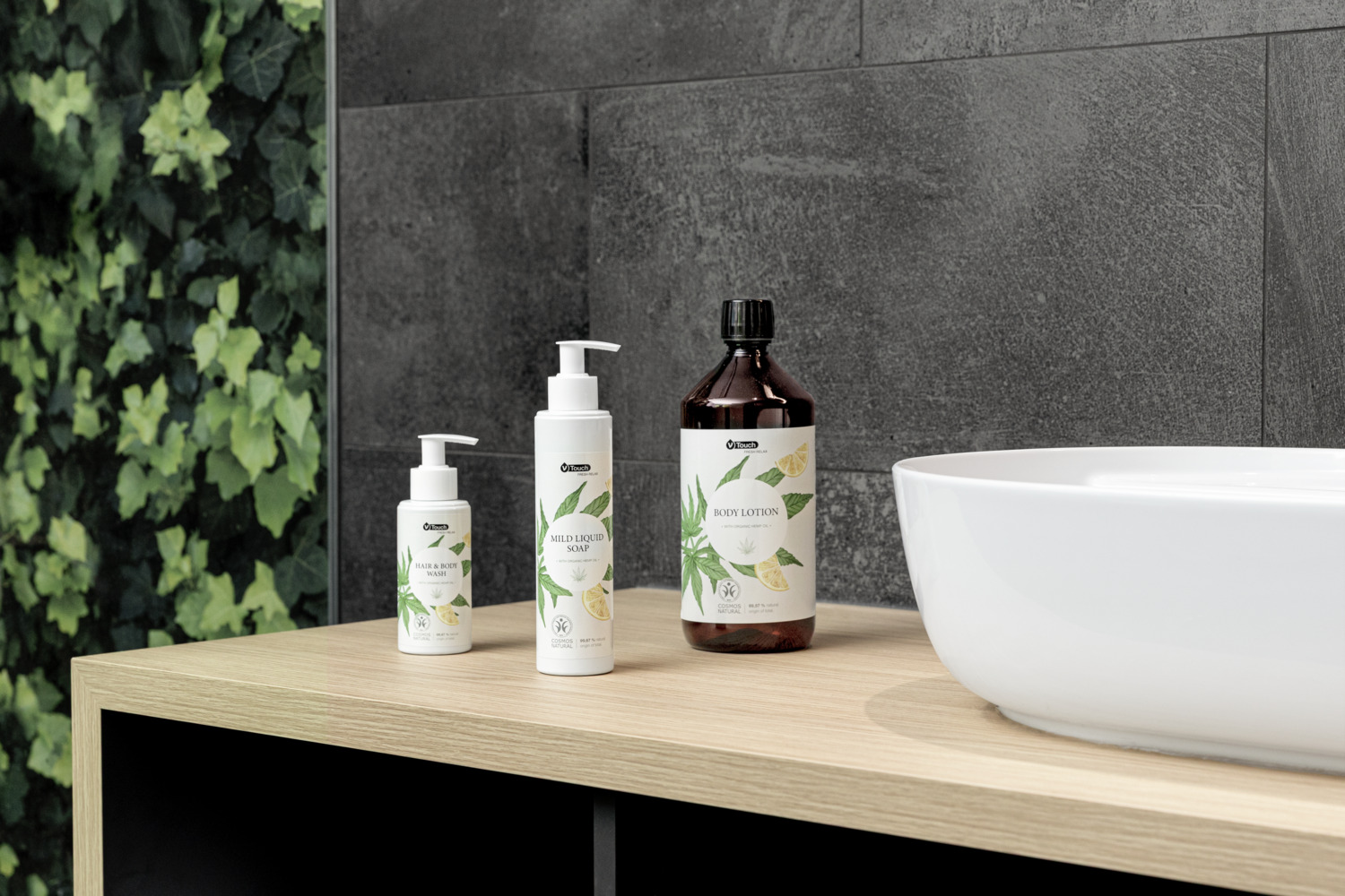 Moisturizing and fast-absorbing body lotion V-Touch Fresh Relax. Certified natural cosmetics with guaranteed genuine hemp oil and a hint of lemon oil for a fresh fragrance. The special composition of hemp oil (Cannabis sativa) with many polyunsaturated fatty acids intensively nourishes the skin. Hemp soothes the skin, provides it with valuable nutrients and creates a pleasant feeling of well-being. Intensively cares for dry and stressed skin and creates a pleasant skin feeling. Suitable for all skin types. Dermatologically tested and pH-neutral. The refill bottle is made from 100% recycled material. Contents: 1000 ml with screw cap.