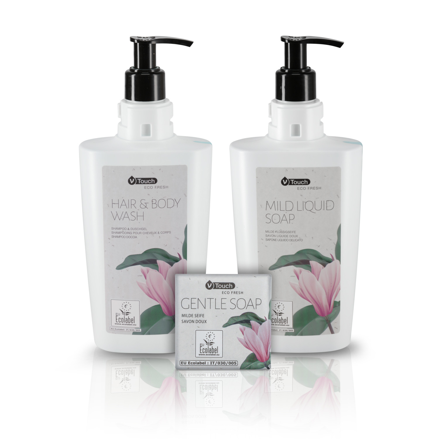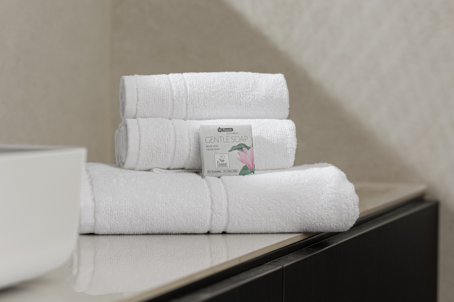 Mild, solid V-Touch Eco-Fresh soap, packaged in a recycled paper carton. The gently foaming hand soap cleans hands and face mildly and reliably. The EU Ecolabel is the ecological quality mark of the European Union and distinguishes products that guarantee high performance standards but have a lower environmental impact throughout their life cycle. Dermatologically tested and pH-neutral. The soap is individually packaged.