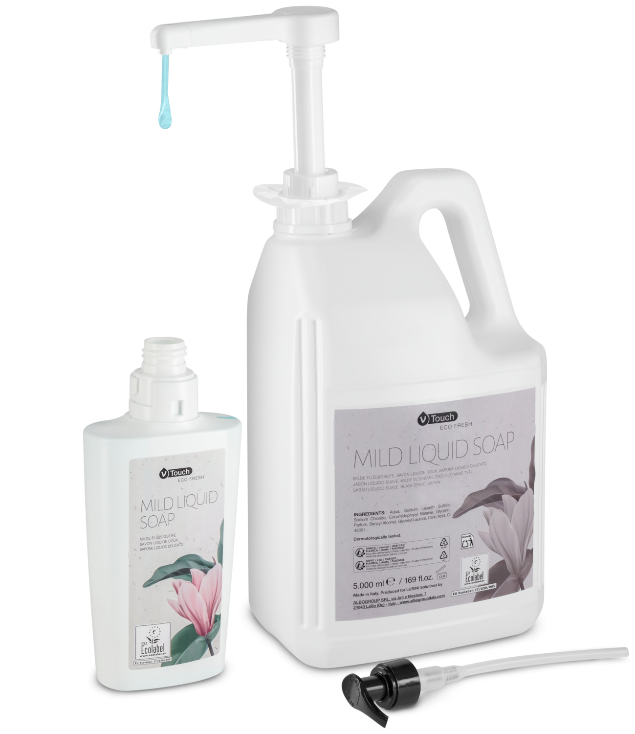 Mild, Ecolabel-certified and environmentally friendly V-Touch Eco Fresh liquid soap in a practical refill canister. Cleans and cares for hands and body equally well. The EU Ecolabel is the ecological quality mark of the European Union and distinguishes products that guarantee high performance standards but have a lower environmental impact throughout their life cycle. Dermatologically tested and pH-neutral. Contents: 5000 ml.