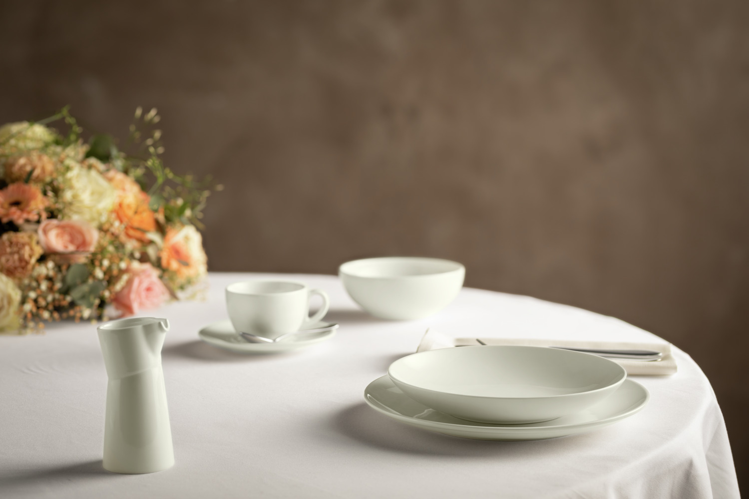 Porcelain jug with a slightly creamy color. Modern design. High resistance. Brilliant glaze. Dishwasher safe and microwaveable.