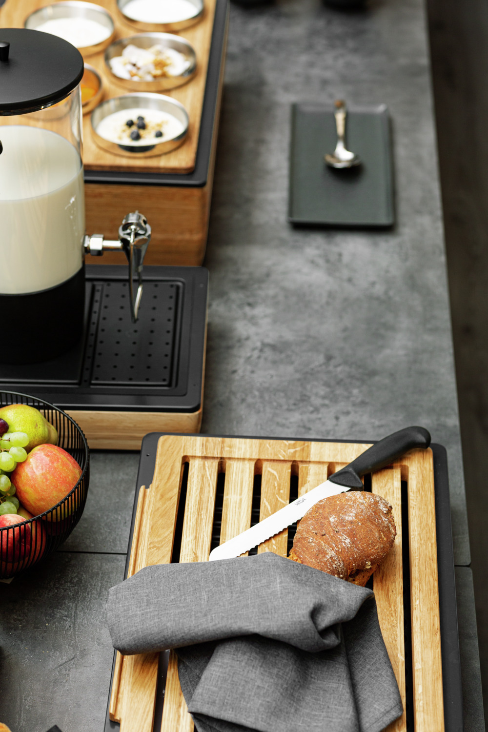 The juice dispenser set consists of the buffet box flat 1/2 made of solid oak wood with MDF panel, a base container made of high-quality plastic with a heat resistance of up to 70°C and the individual Hampton dispenser made of particularly shatterproof and scratch-resistant Tritan (bisphenol A-free) in its own design. Capacity 4 l. With smooth-running stainless steel tap for counter-pressing, removable, airtight lid, including two cold packs that can be attached to the lid and base and removable drip tray made of 18/10 stainless steel. The drip tray is suitable for dishwasher, all other parts are not.