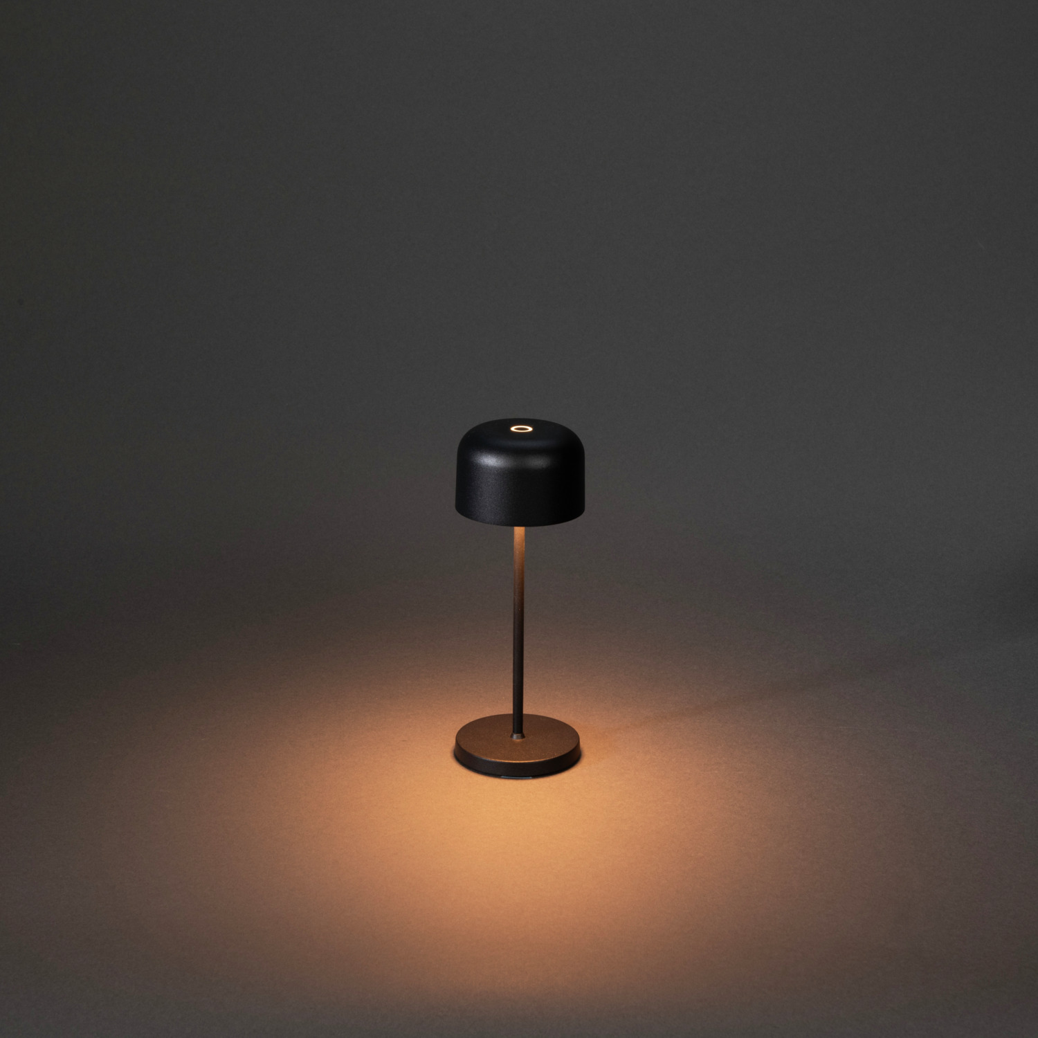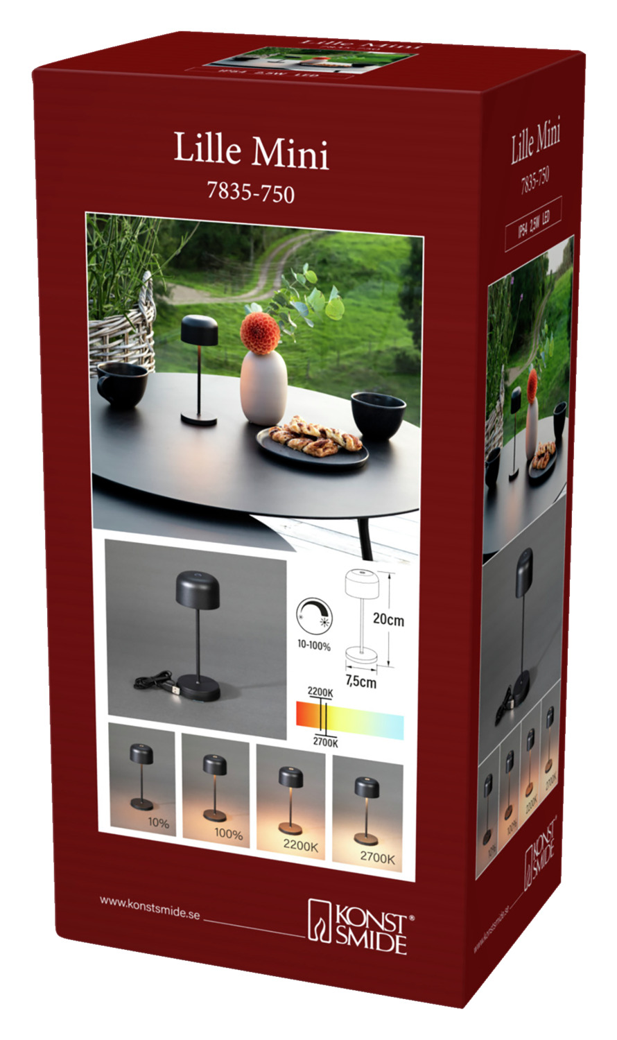Add stylish and discreet lighting to your home, restaurant or hotel room, indoors or outdoors, with the Lille Mini table lamp in elegant black. With a compact height of just 20 cm, it blends discreetly and tastefully onto tables – perfect for use in restaurants, on tables or in the garden. The light is emitted below eye level, preventing glare. Thanks to the infinitely dimmable function, you can adjust the light intensity to suit your mood. Main features: Weatherproof to IP54 – suitable for outdoor use Only 20 cm high – ideal for use on tables without dominating them Light below eye level – glare-free light for a pleasant atmosphere Infinitely dimmable – individual light control for every mood Electrical data – power supply: 230 V, 50 Hz, light source: LED, replaceable, output: approx. 4-6 watts, light colour: warm white (approx. 2200-2700K) Discreet design – blends in unobtrusively, provides pleasant light High-quality workmanship – durable and robust Versatile use – perfect for restaurants, gardens, sleeping areas or at home Opt for high-quality, stylish lighting that blends harmoniously into any environment. The Lille Mini is the ideal choice for discreet, glare-free light that adapts flexibly to your needs and creates a pleasant atmosphere. Charging cable included in the package.