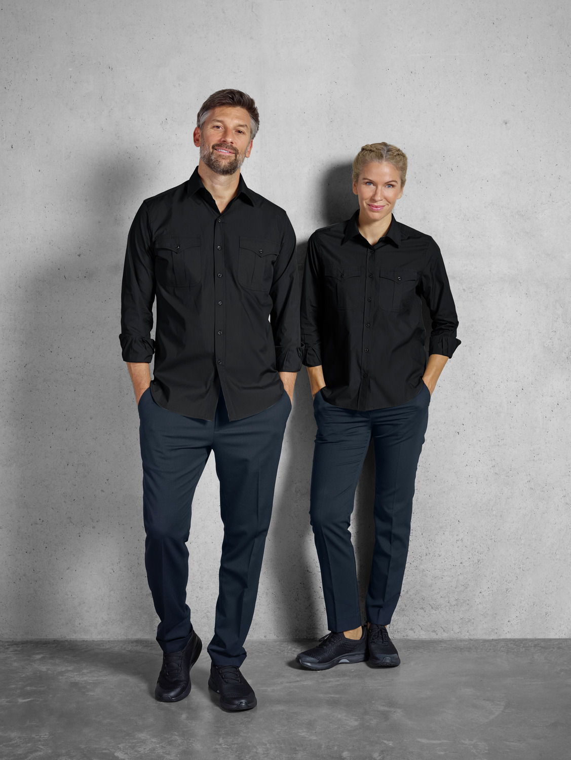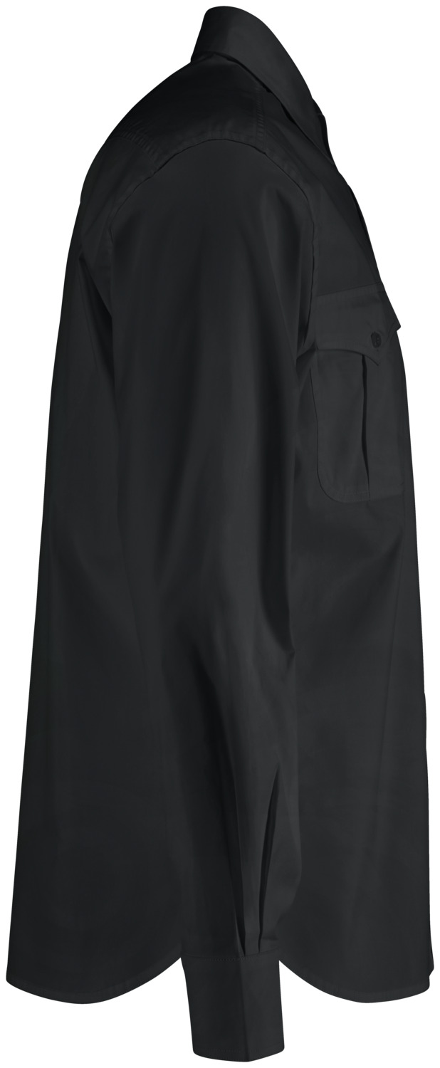 67 % cotton, 33 % polyester. 30°C wash. Modern, long-sleeved men’s shirt in a denim shirt look, with a visible button placket, classic shirt collar and sleeve cuffs. With two patch breast pockets and a tapered back yoke. The hem is rounded. Particularly easy-care and easy-iron thanks to the polyester content. Without waist seams. Regular fit. Back length: 80 cm for size 39/40.