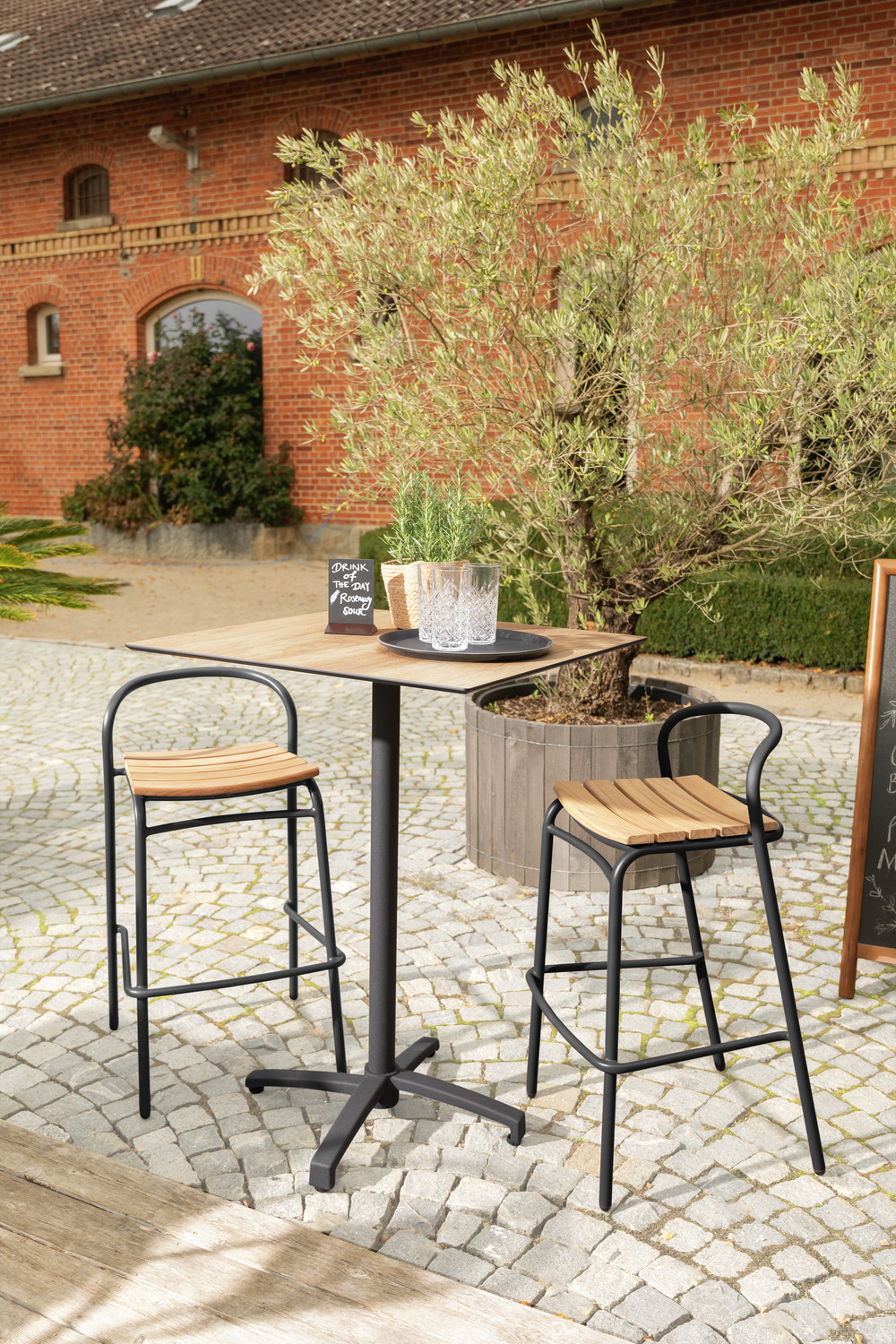 Table base made of anodized or powder-coated aluminium for mounting table tops. Specially shaped table legs and foldable table cross for space-saving storage. Side-stackable. Suitable for indoor and outdoor use. Supplied disassembled. Includes adjusting screws to compensate for minor floor unevenness. Simple assembly. Please note the table top size requirements to ensure the stability of the sturdy base.