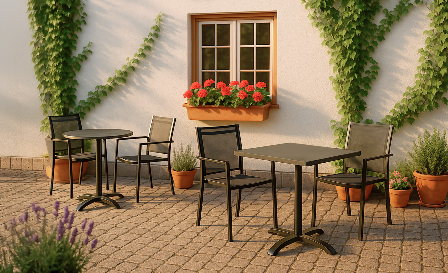 The hard-wearing Sevelit dining table consists of the durable Sevelit table top (1.6 cm thick) with fully sealed plastic protective edge (2.7 – 3 cm) and the sturdy Keto aluminum frame (Ø frame: 6.0 cm) ensures high stability. Suitable for outdoor use. Simple assembly is quick and easy with the fixing material supplied.