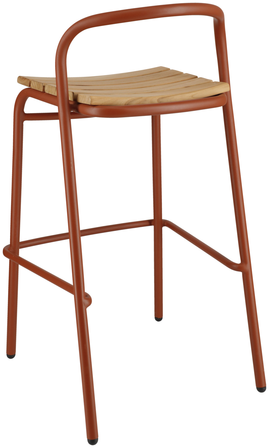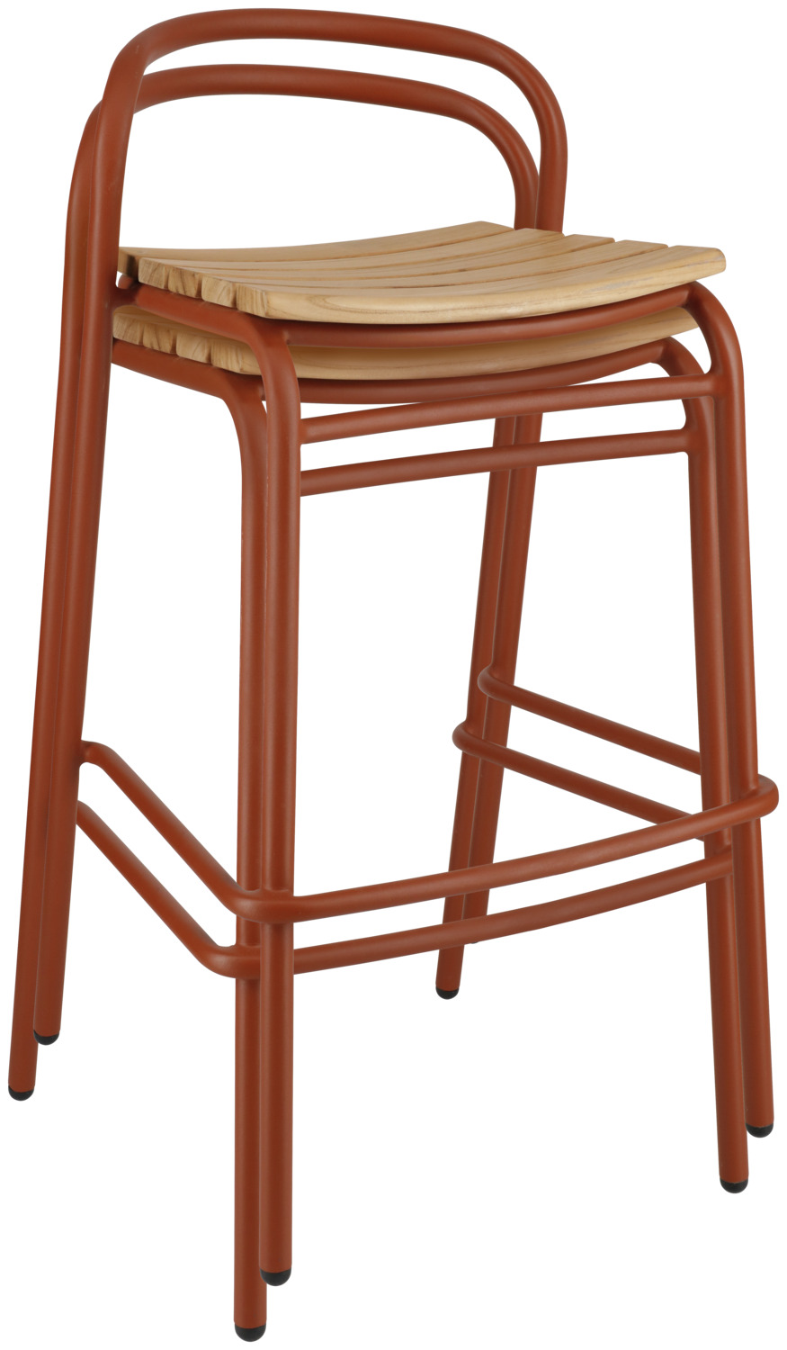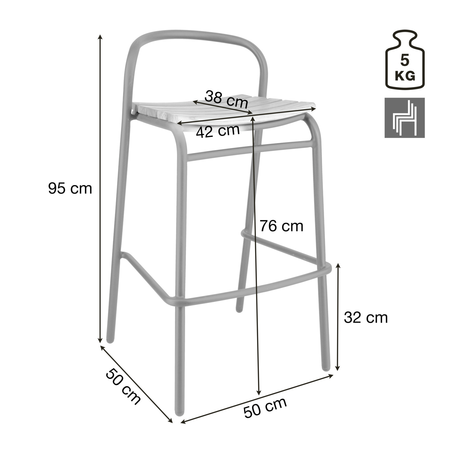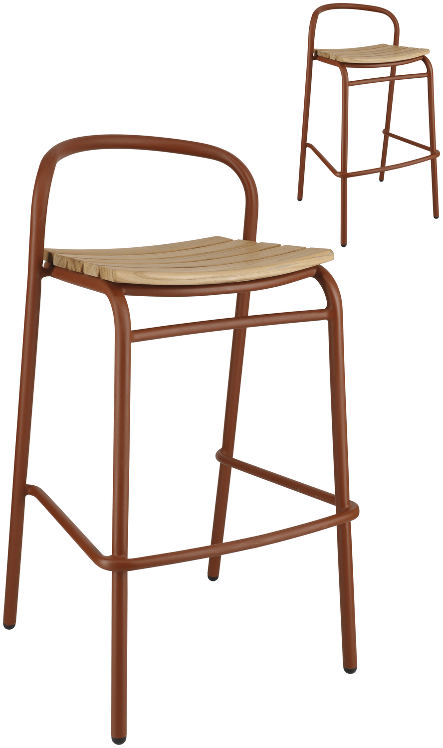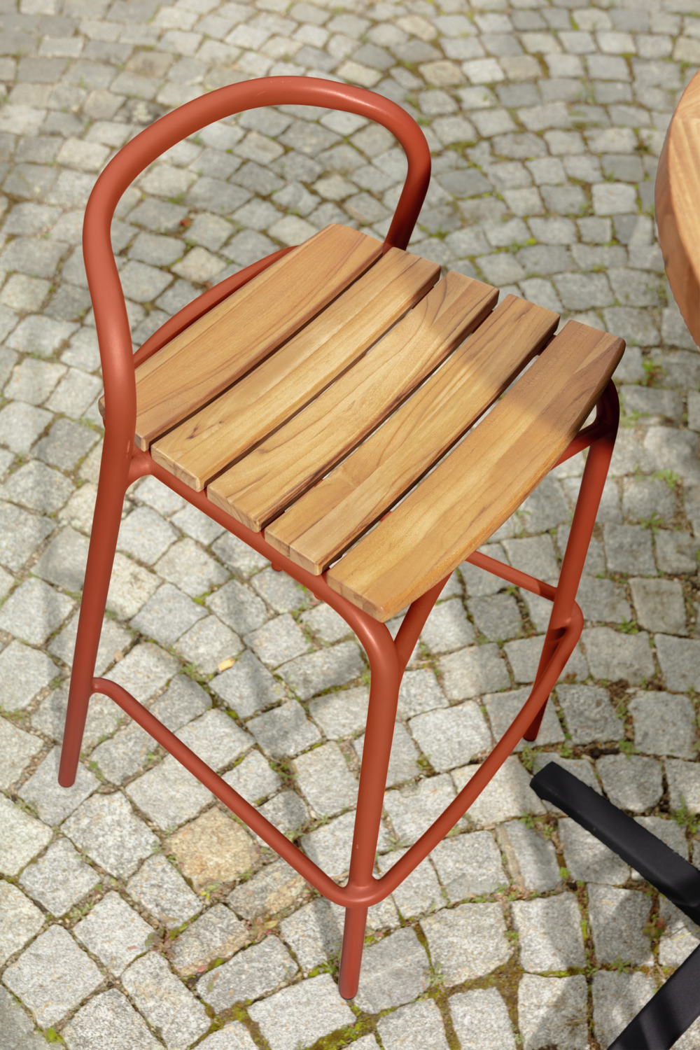 This high-quality outdoor bar chair for the hospitality industry combines a modern, sturdy aluminium frame with elegant teak slats on the seat and backrest. This makes the bar chair perfect for restaurants, outdoor bars, hotels, cafés and rooftop lounges that value stylish, durable and weatherproof outdoor furniture. Thanks to the combination of aluminium and solid teak, the bar chair is UV-resistant, weatherproof and ideal for both indoor and outdoor areas. Plastic glides protect the floor and allow it to be moved smoothly and quietly – ideal for busy patios and bar areas. The bar stool is delivered assembled and is ready for immediate use. Matching catering tables or bar tables can be ordered at the same time. **Teak care instructions – ideal for the professional outdoor area** The teak slats are made of high-quality, untreated teak, which is characterised by its particular resistance to weathering – perfect for daily use in outdoor catering areas. We recommend allowing the teak to weather naturally. After some time, the typical, elegant silver-grey patina that makes teak furniture so full of character will develop. All you need for regular cleaning is warm water and a soft brush – quick, hygienic and uncomplicated in everyday catering. For anyone who wants to preserve the original warm wood colour: Treat with special teak oil once or twice a year (clean thoroughly beforehand). * High-quality outdoor bar chair made from aluminium & teak * Weatherproof & UV-resistant – ideal for terraces, outdoor bars & rooftops * Ergonomic teak slats for a natural look & high seating comfort * With plastic glides – floor-friendly & low-noise * Delivered assembled – ready for immediate use * Order matching bar tables & tables directly * Easy to clean & suitable for professional use The perfect bar stool for stylish outdoor catering areas – durable, modern and absolutely suitable for catering.