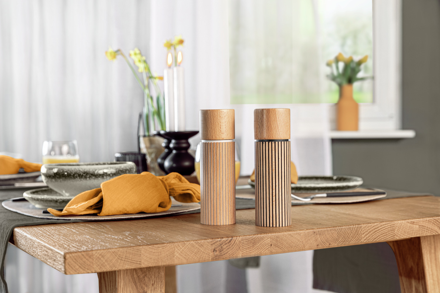 Modern pepper mill with grooved design and black lacquer finish to make the contents visible from the outside. Features a particularly light and durable carbon steel grinding mechanism.