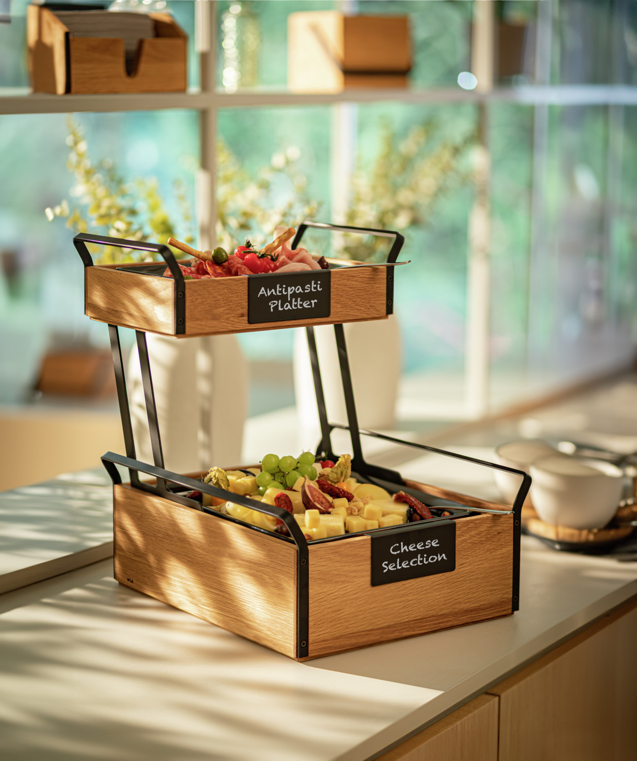 The two-tier Esino refrigerated display case consists of: 2x the base box flat 1/2 made of oak wood, 2x the base tray made of high-quality plastic with a heat resistance of up to +70°C, 2x the matching polyethylene cold pack and 2x the black, stackable, impact- and break-resistant presentation platter made of melamine GN size 1/2 (application range: -30°C to +70°C). The matching plug-in plates are supplied, allowing easy assembly by simply plugging the individual parts together. The presentation platters are dishwasher safe, all other parts are not. A matching roll-top hood, hygiene protection and labeling boards are available separately.