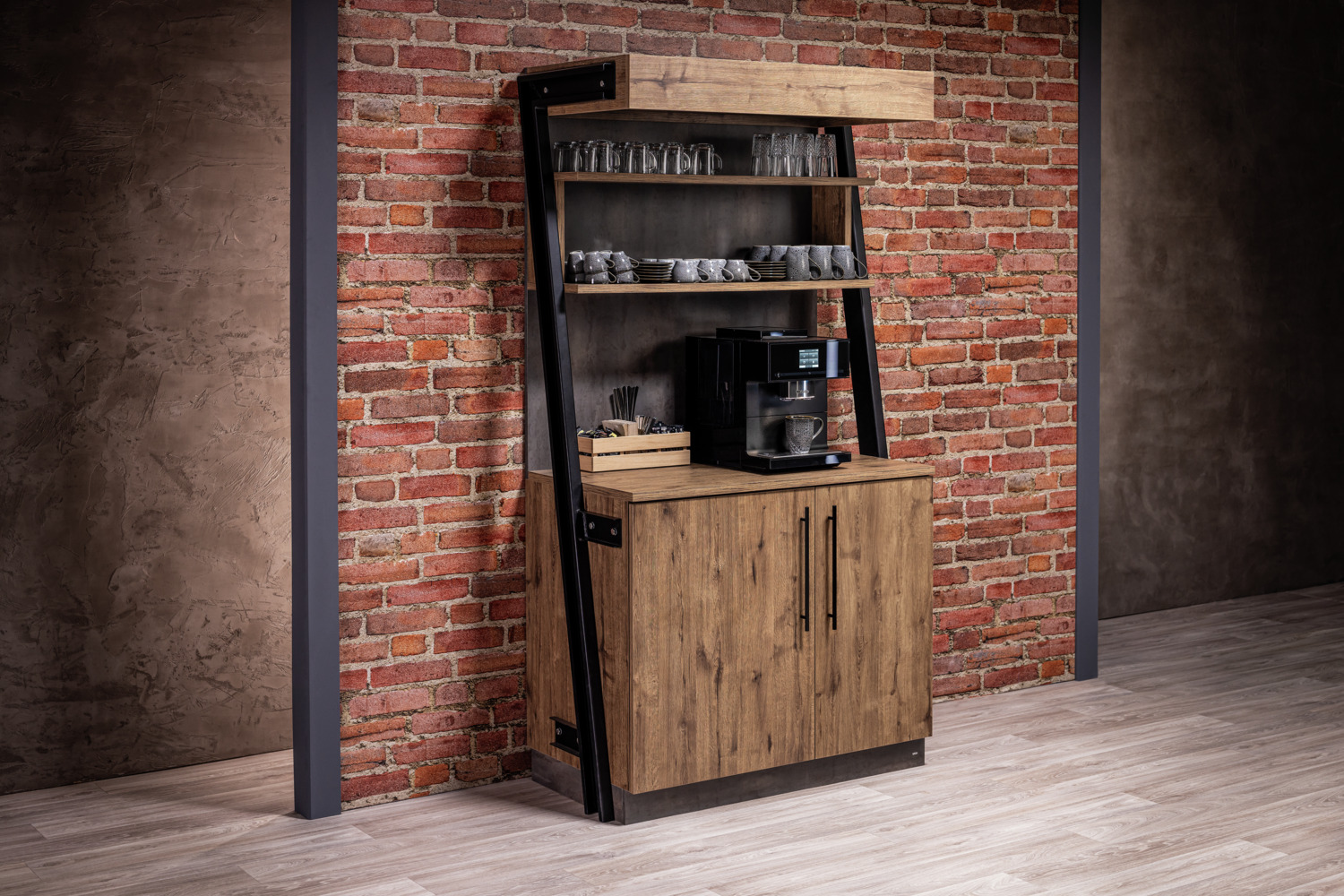 The Baristo Industrial service station is the perfect piece of furniture for restaurants, cafés, bakeries or business areas, whether as a self-service coffee station or service point in everyday catering. The sturdy storage surface provides space for professional coffee machines, cash register systems or menus and everything that needs to be within easy reach. Maximum load of the work surface 80 kg. The Industrial system consists of wood-based panels and steel beams. * 2 different color versions available * 2 hinged doors with high-quality hinges and two height-adjustable shelves (max. load 25 kg per shelf) * Includes shelving system, framed by two steel side panels * Shelving system can be used at different heights * Distance between shelving systems 30 cm * Floor-leveling adjustable feet * Back with decorative coating for free-standing placement in the room * Delivered partially assembled, base element already assembled * Assembly material included with the additional elements * Suitable for indoor use only