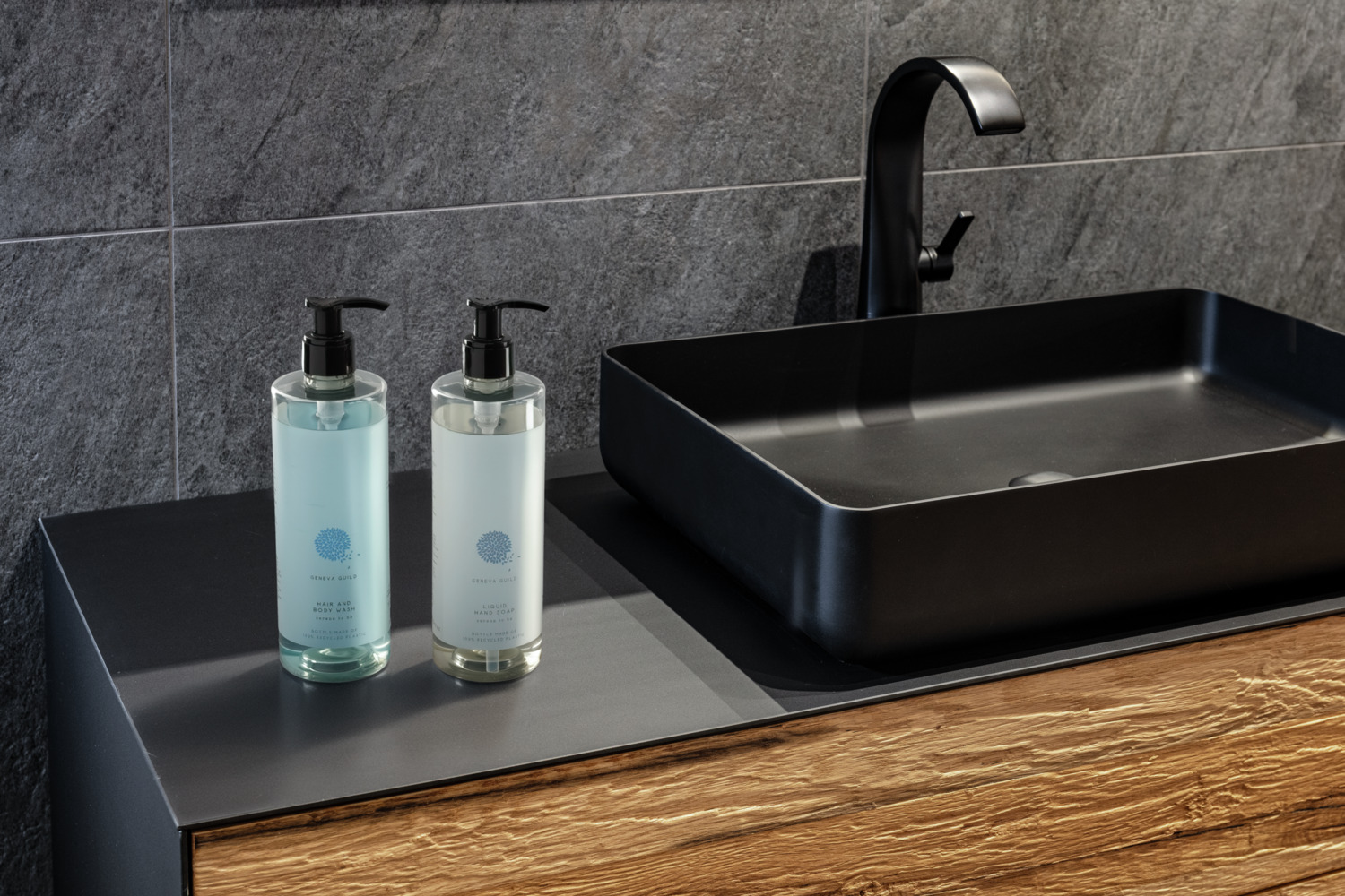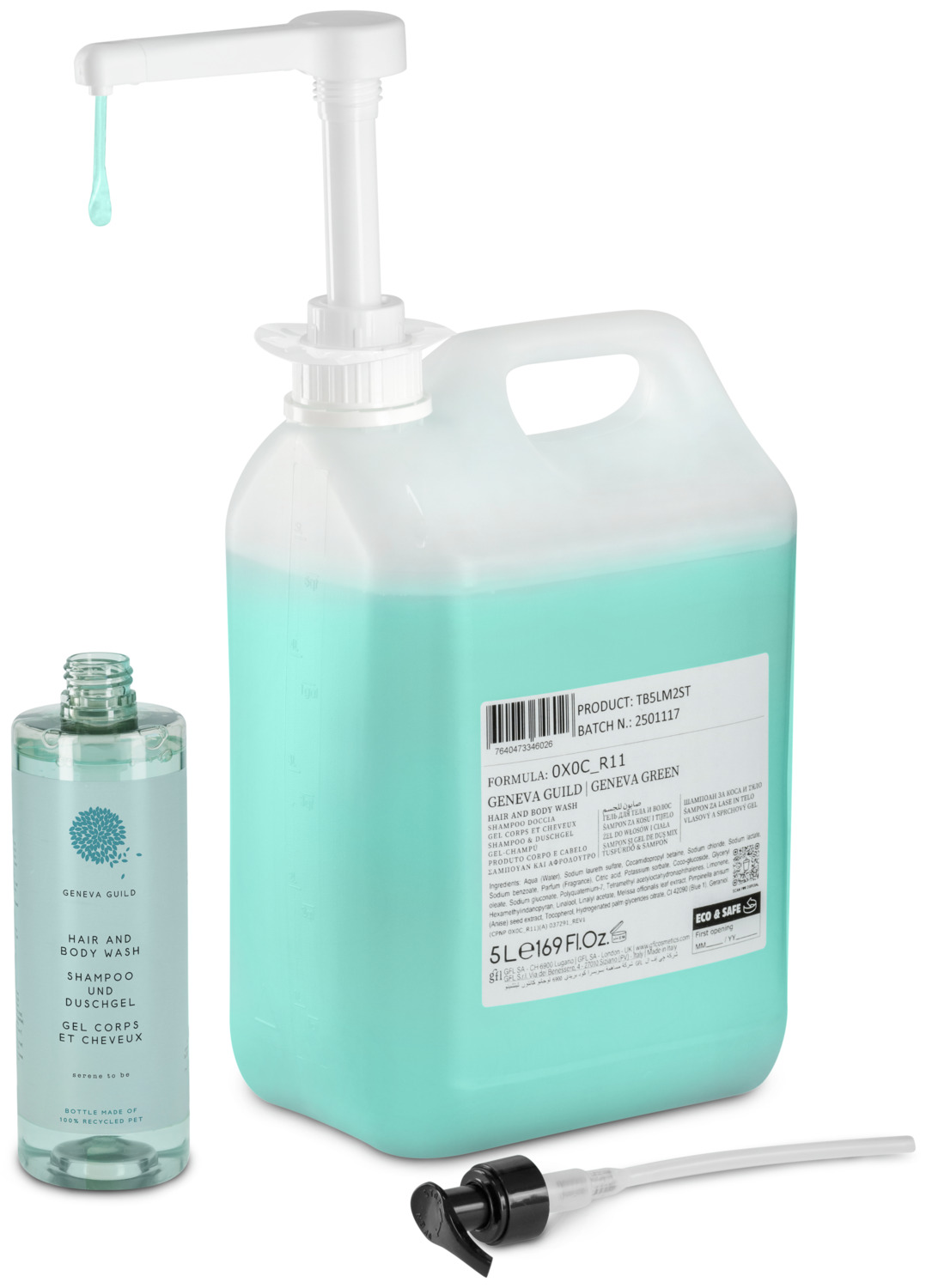 Mild, combined hair shampoo and shower gel Geneva Guild. A two-in-one care product in a class of its own. The gently cleansing shampoo and shower gel is suitable for all hair and skin types. The exquisite fragrance nuances ensure a fresh and hygienic feeling. Enriched with extracts of organic green anise and lemon balm. Dermatologically tested and pH-neutral. The practical pump dispenser made of rPET can be refilled easily and flexibly. The entire packaging is 100% recyclable. Pump bottle capacity: 380 ml. Order matching holder separately.