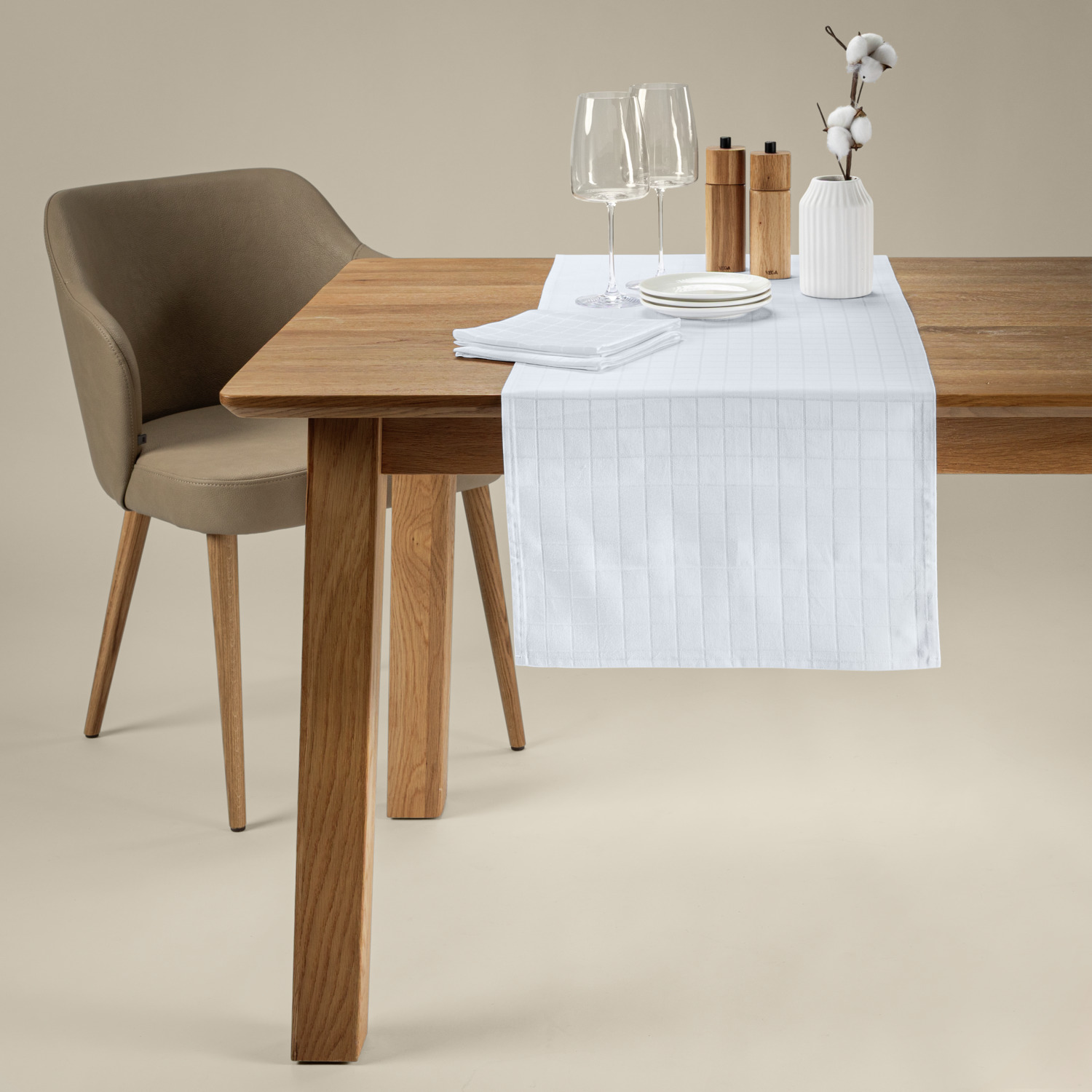 ##Fully twisted table runner Avella – Classically elegant with a checked pattern The Avella table runner made of 100% full-twist cotton combines high-quality workmanship with a timeless, classic design. The damask chequered pattern lends any table an elegant, sophisticated atmosphere. The particularly smooth and dense fabric with a firm feel is dimensionally stable, easy-care and hard-wearing – perfect for sophisticated catering and festive occasions. The full-twist quality guarantees a long service life that will impress in both modern and upmarket restaurants. * 100% cotton full-twist, mercerised * Weight approx. 200 g/m² * Classic damask check pattern for an elegant look * Particularly smooth, dense fabric with a firm feel * Finished with a 1 cm standard hem * Dimensionally stable, easy-care and hard-wearing * Boil- and chlorine-resistant, as well as shrink-proof
