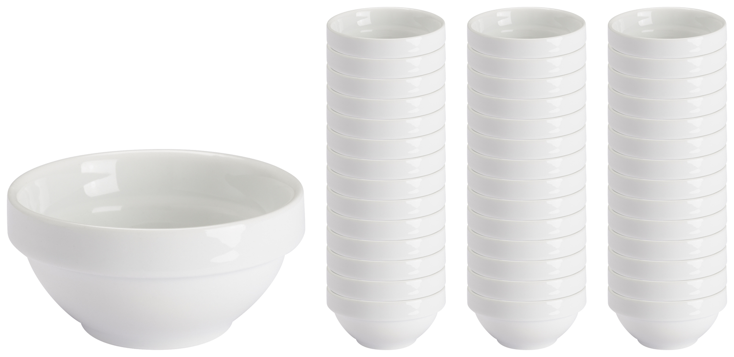 Simple white porcelain bowl in classic round shape. Stackable, microwaveable and dishwasher safe.