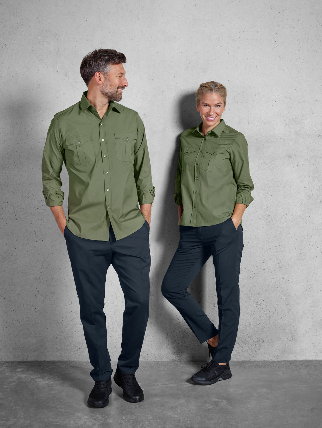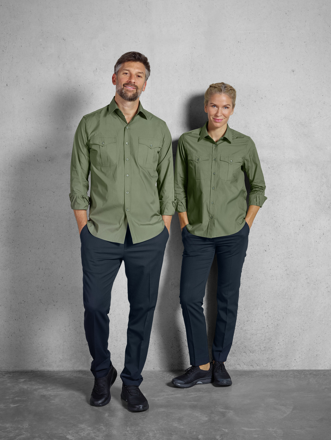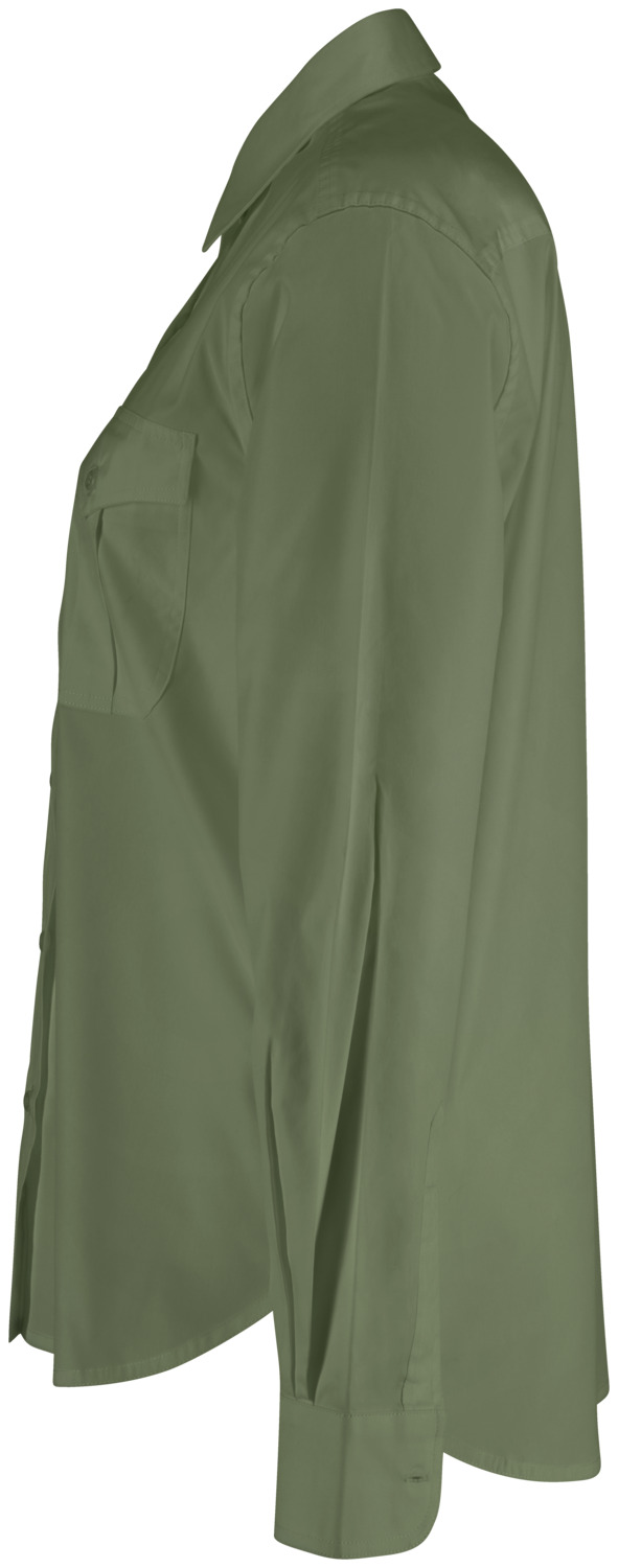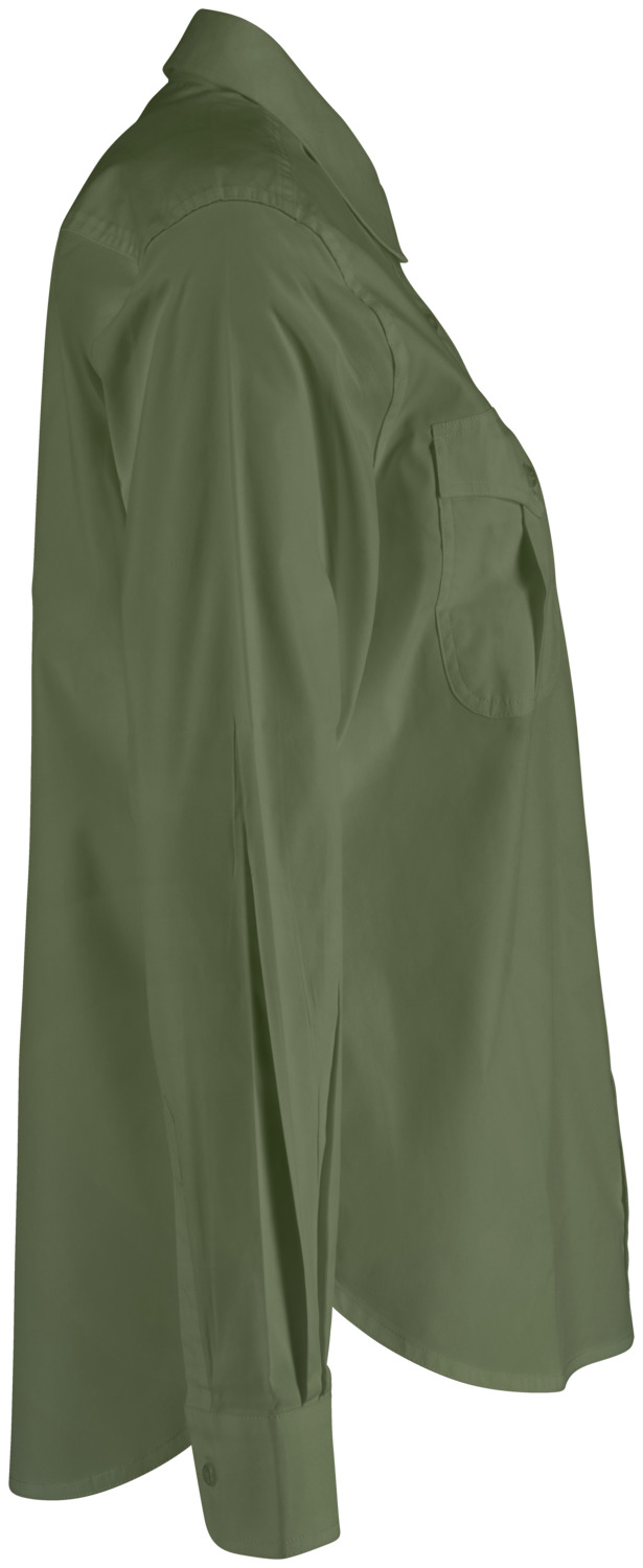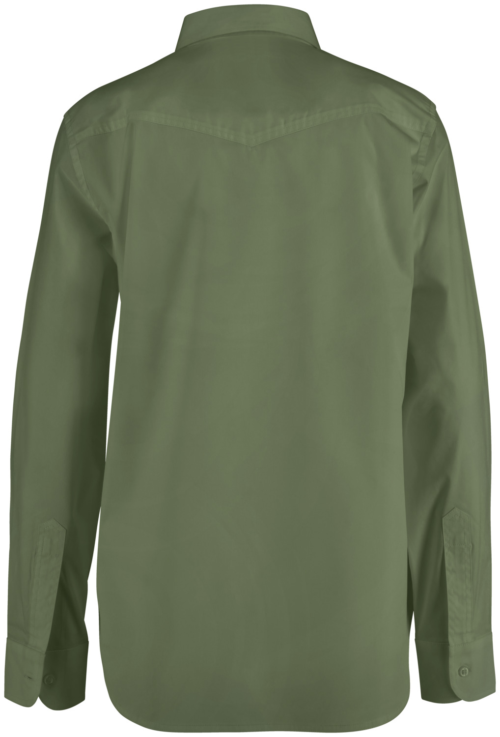 67 % cotton, 33 % polyester. 30°C wash. Modern, long-sleeved blouse in a denim shirt look, with a visible button placket, classic shirt collar and sleeve cuffs. With two patch breast pockets and a tapered back yoke. The hem is rounded. Particularly easy-care and easy-iron thanks to the polyester content. Without waist seams. Regular fit. Back length: 71 cm for size 36.