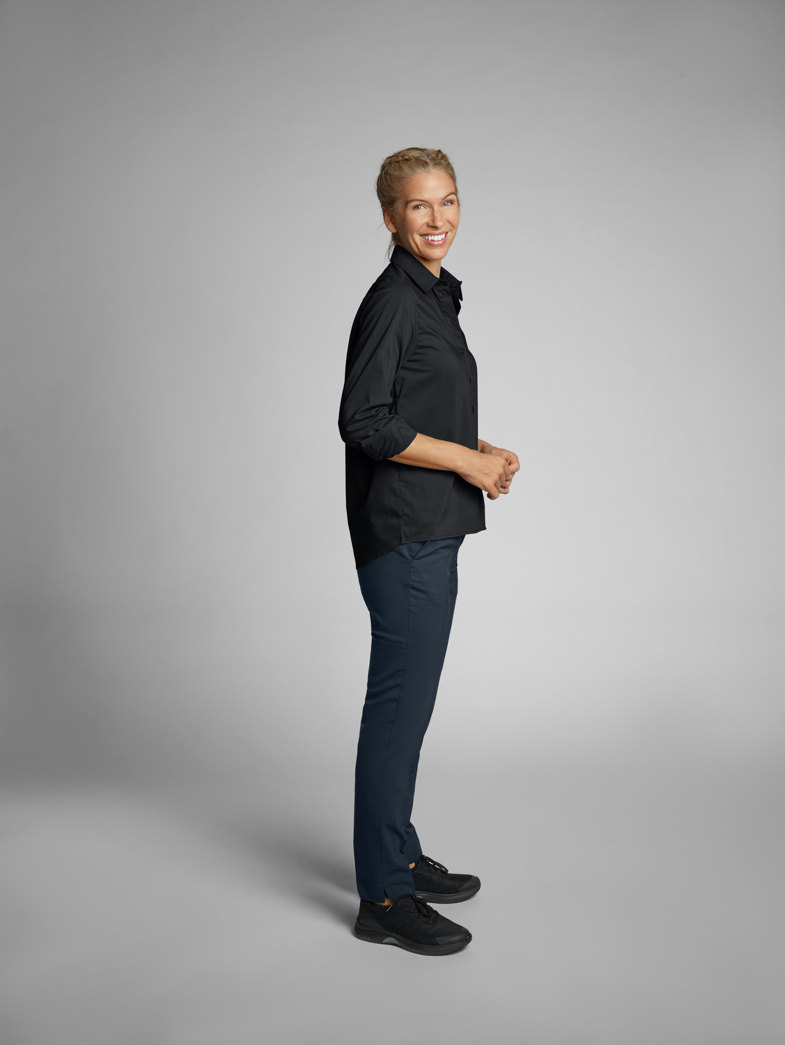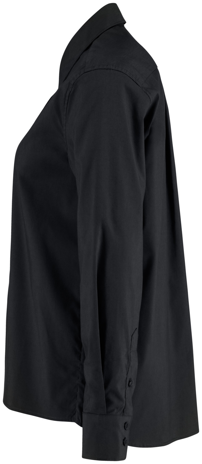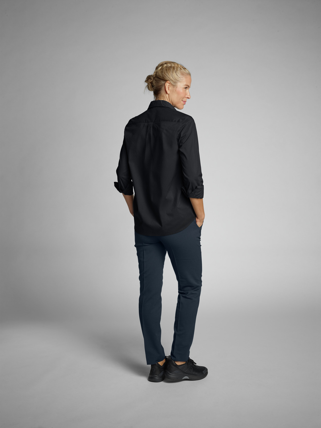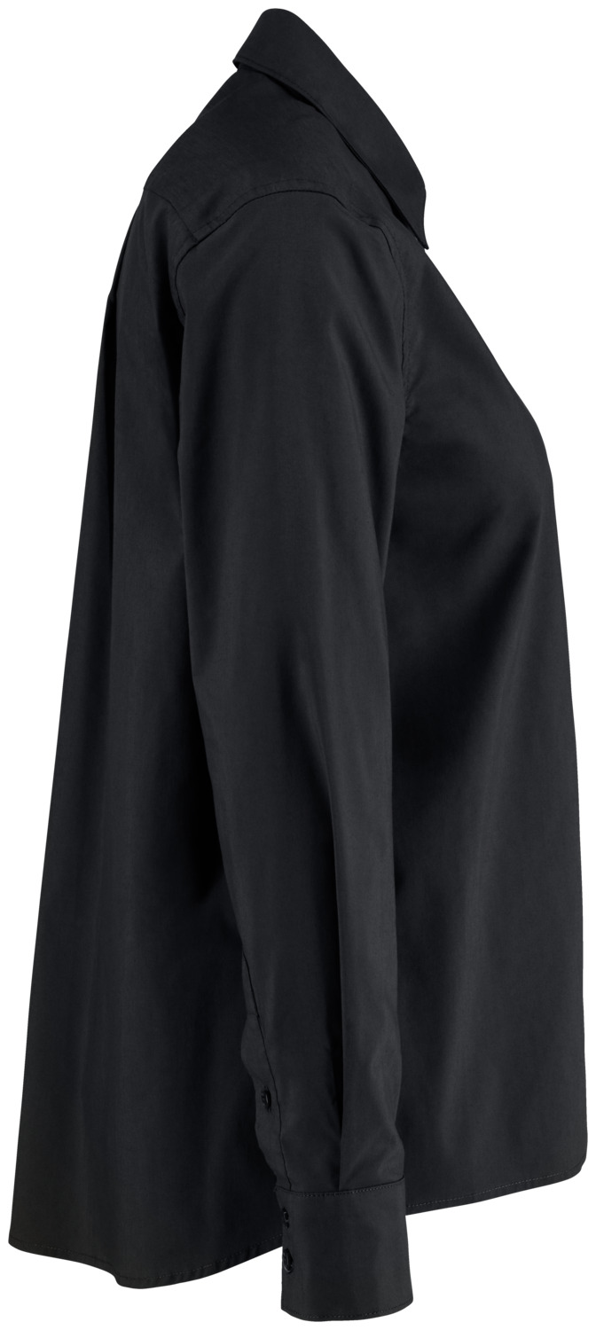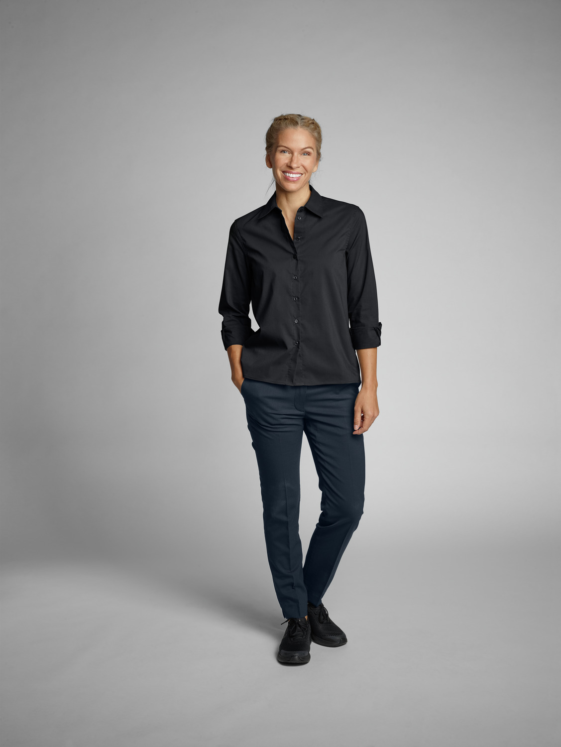 67% cotton, 33% polyester. 30° wash. Modern, casually cut long-sleeved women’s blouse with visible button placket, classic shirt collar and sleeve cuffs. With a rounded hem that is longer at the front and back. Without waist seams, with a movement pleat at the back and cut in a comfortable A-line shape. Comfort fit. Back length: 72 cm for size 36.