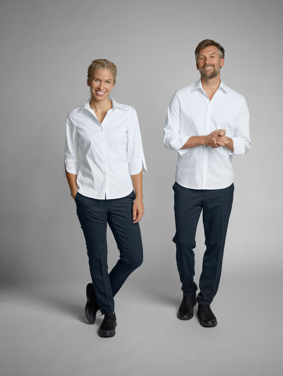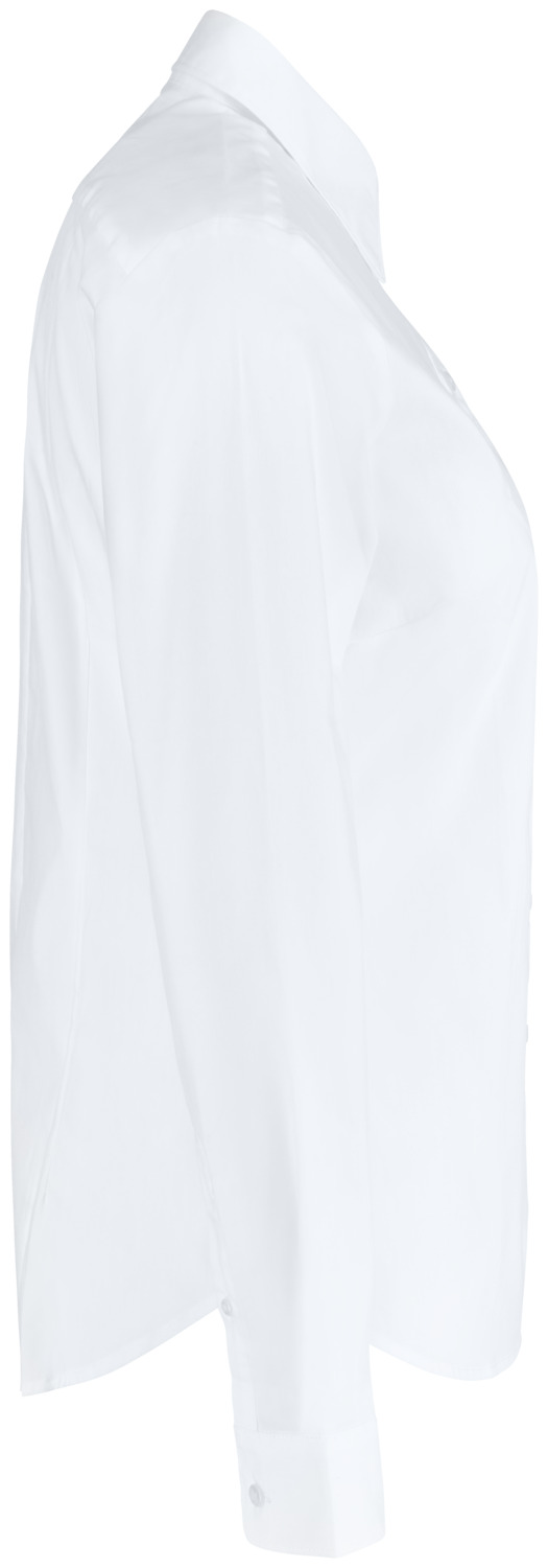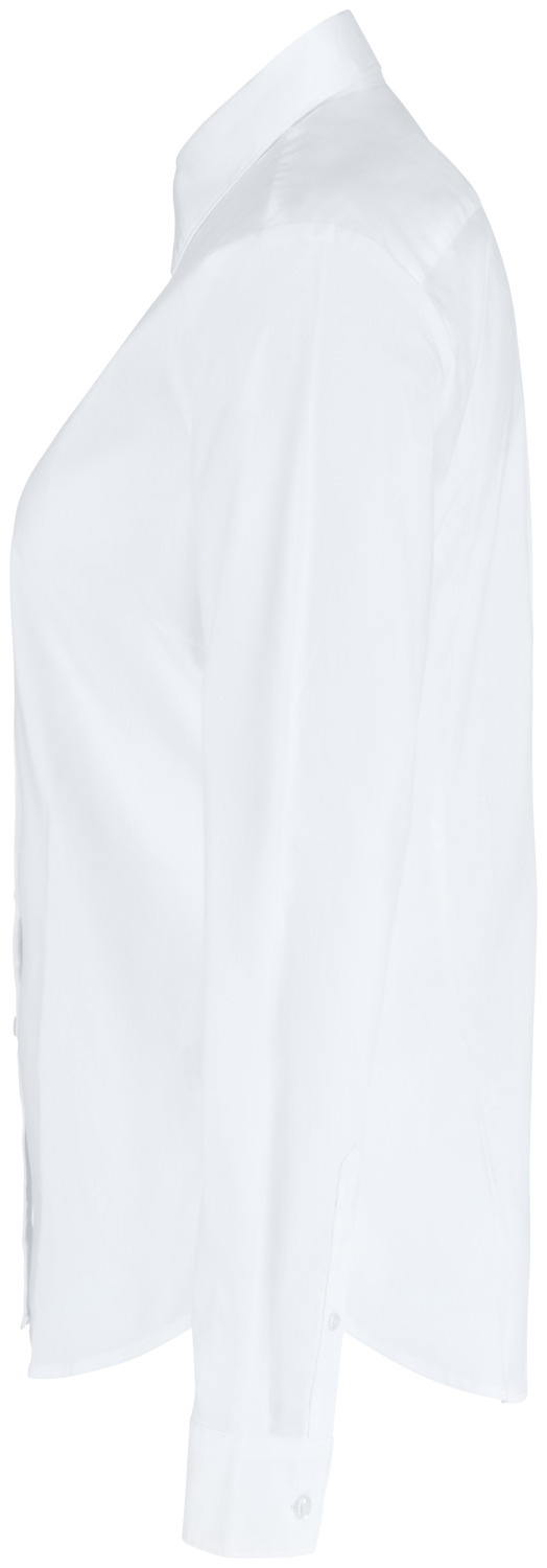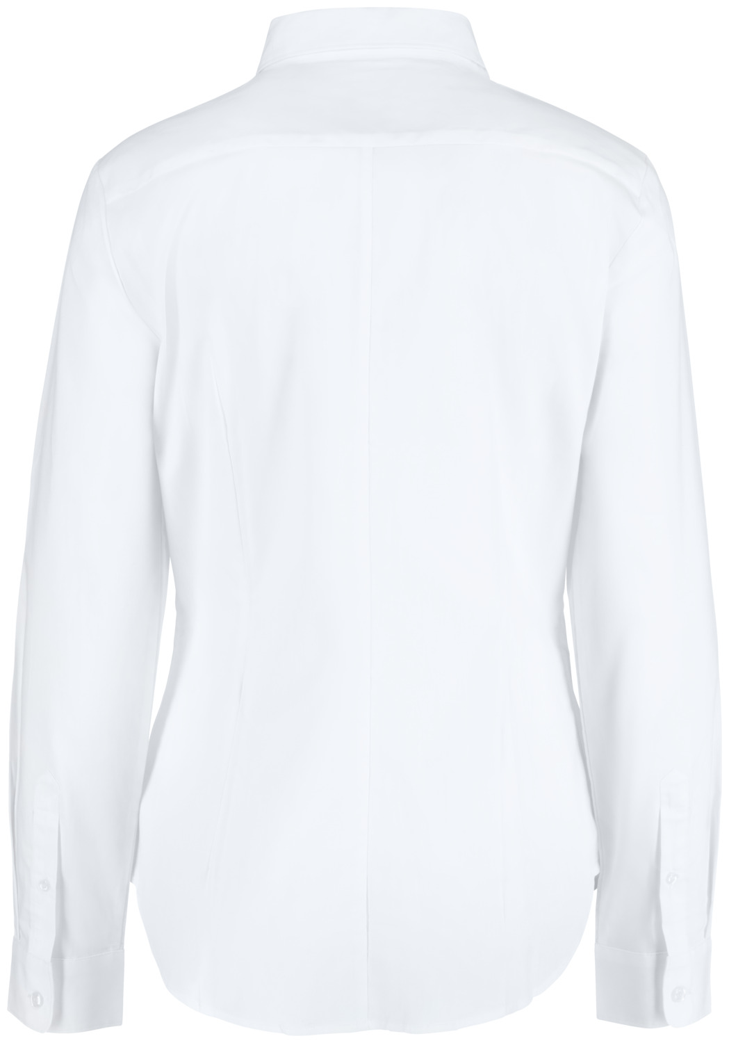 67 % cotton, 33 % polyester. 30°C wash. Classic, long-sleeved ladies’ blouse with visible button placket, shirt collar and sleeve cuffs. With short bust darts and waist seams at the back for a perfect fit. Extra-long back and rounded hem. Particularly easy-care and easy-iron thanks to the polyester content. Regular fit. Back length: 68 cm for size 36.