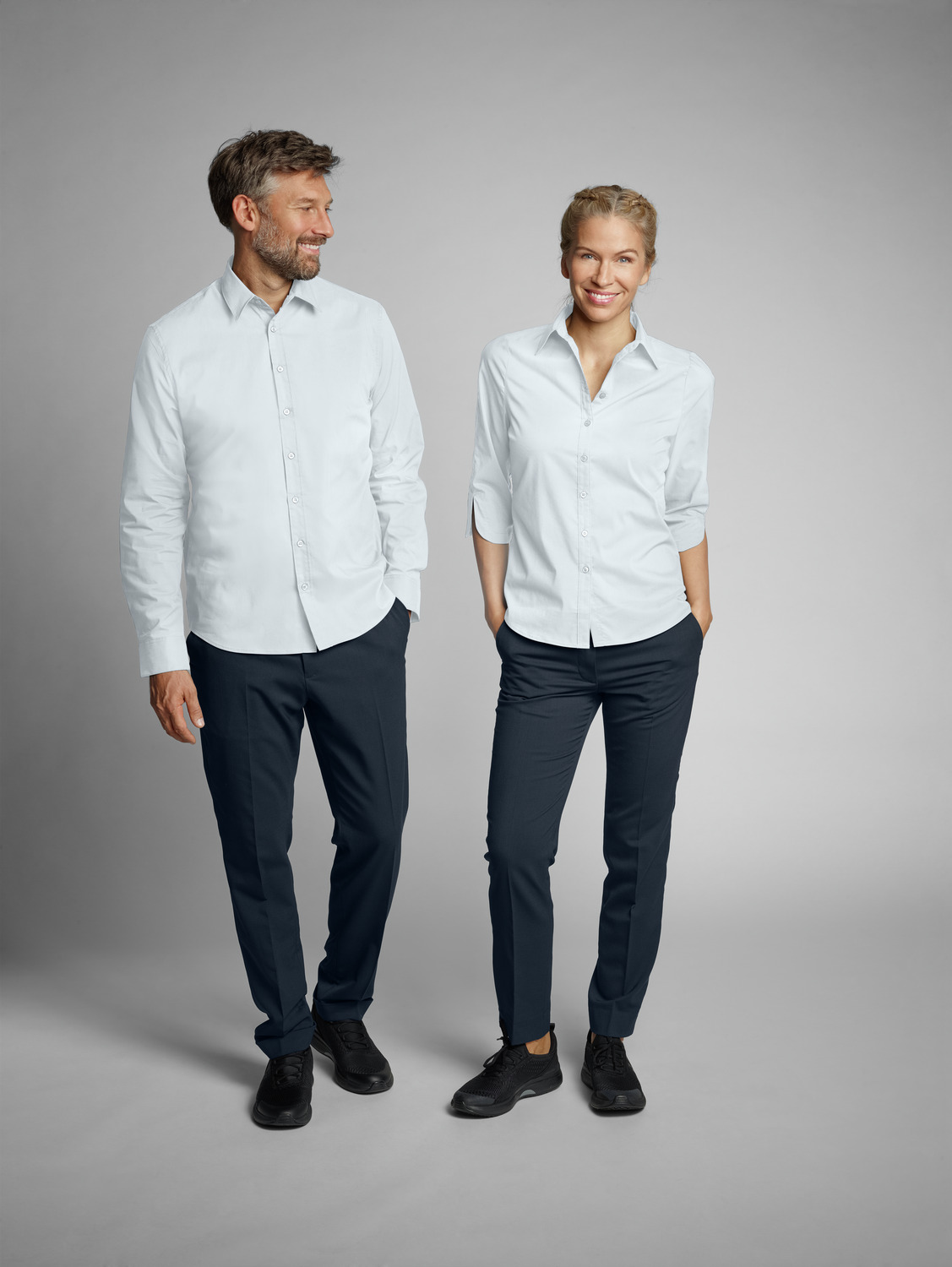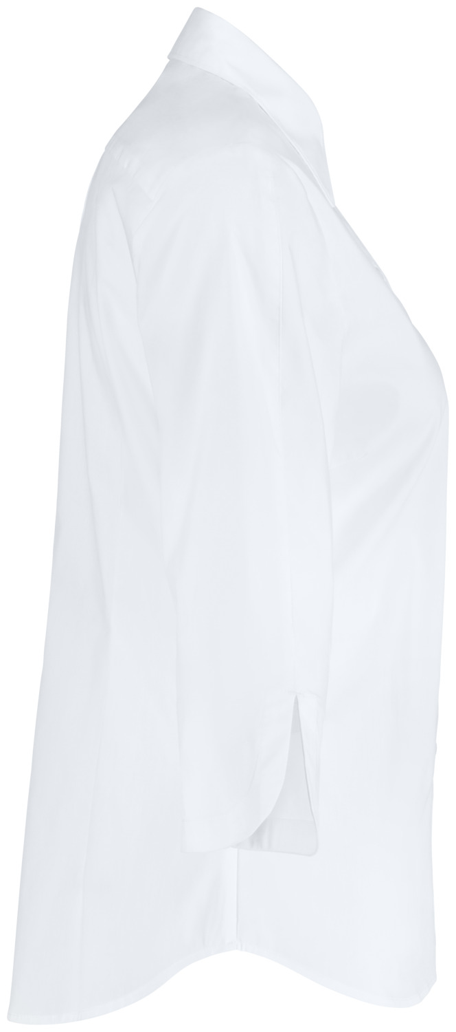 67 % cotton, 33 % polyester. 30°C wash. Classic, ladies’ blouse with three-quarter length sleeves, visible button placket and shirt collar. Sleeves with a rounded slit for optimum freedom of movement at the elbow. With short bust darts and waist seams at the back for a perfect fit. Extra-long back and rounded hem. Particularly easy-care and easy-iron thanks to the polyester content. Regular fit. Back length: 68 cm for size 36.