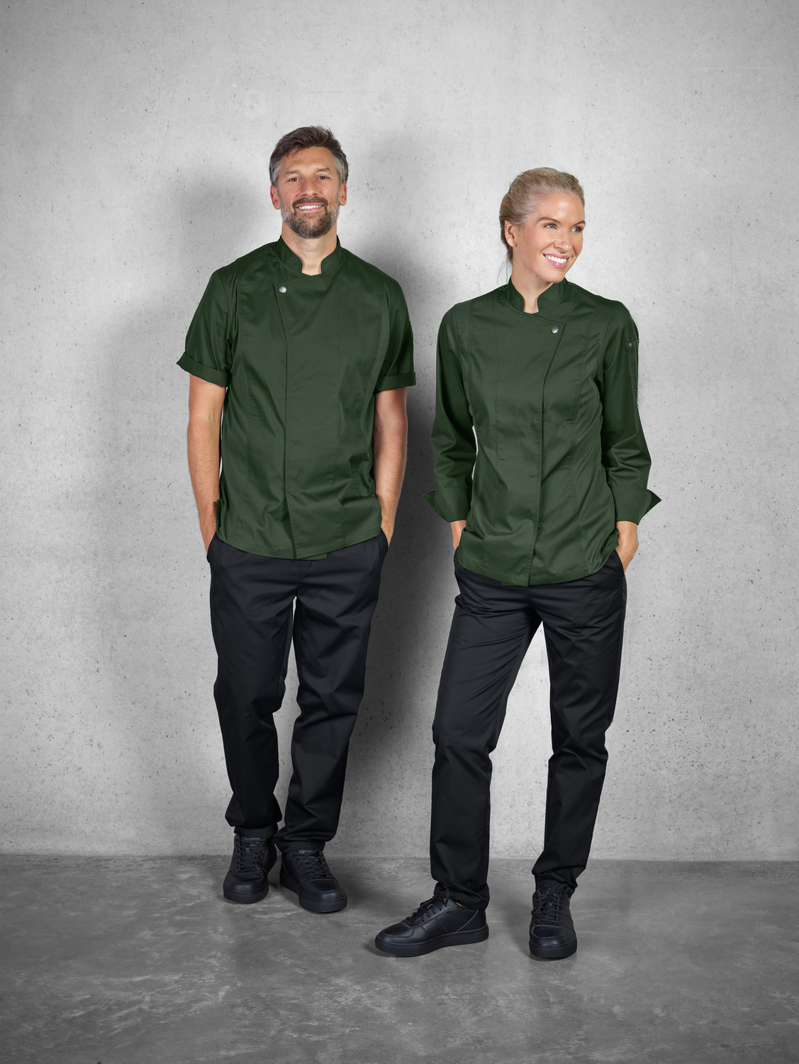 65 % polyester, 35 % cotton. 240 g/m². 60 °C wash. Classic, comfortable women’s chef trousers made of skin-friendly, stain-resistant material. Back part with one back pocket and comfortable stretch waistband, on the side with two round slit pockets and on the right thigh with thermometer pocket. At the waistband are belt loops. Straight cut with high waistband. Inside leg length: 80 cm for size 36.